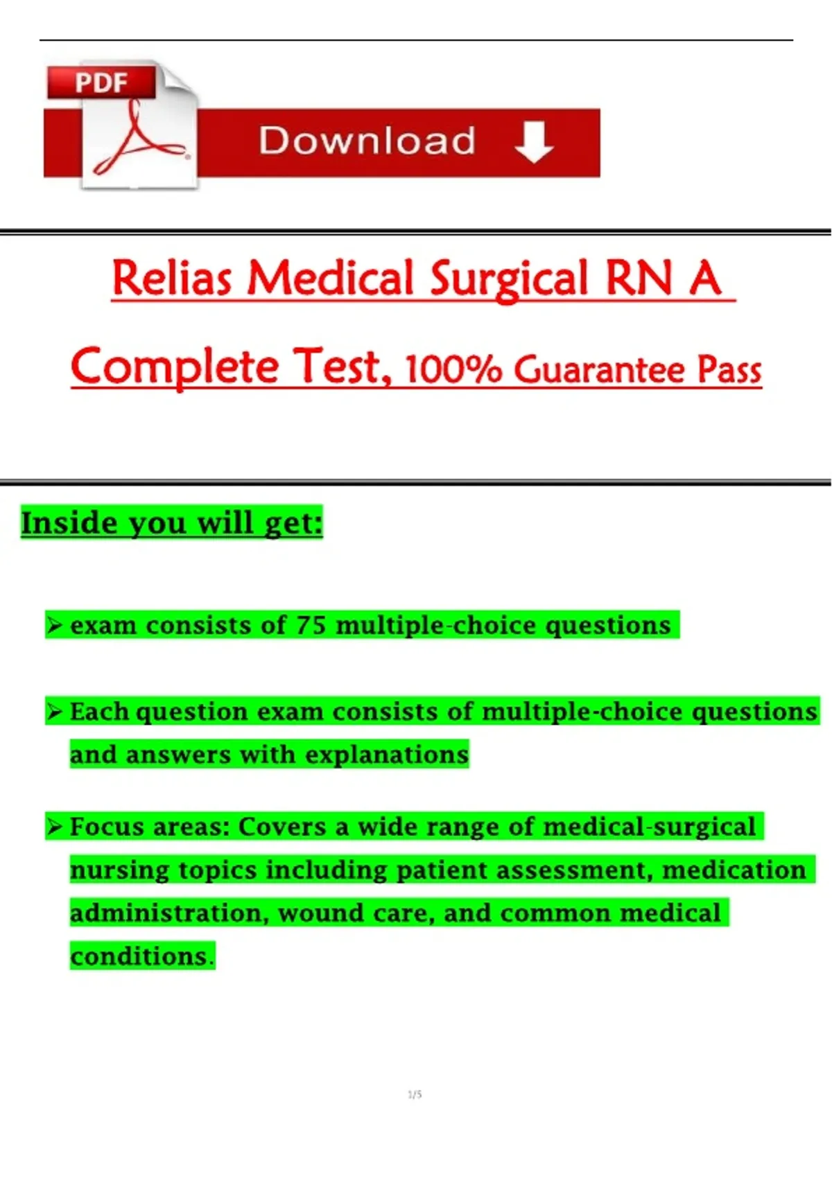This study guide provides a complete set of questions for the Relias Medical-Surgical RN A course. It covers all essential medical-surgical nursing topics, including patient assessment, disease processes, interventions, pharmacology, care planning, and clinical reasoning. Correct answers are provided for each question to support mastery, reinforce understanding, and ensure readiness to pass the exam.