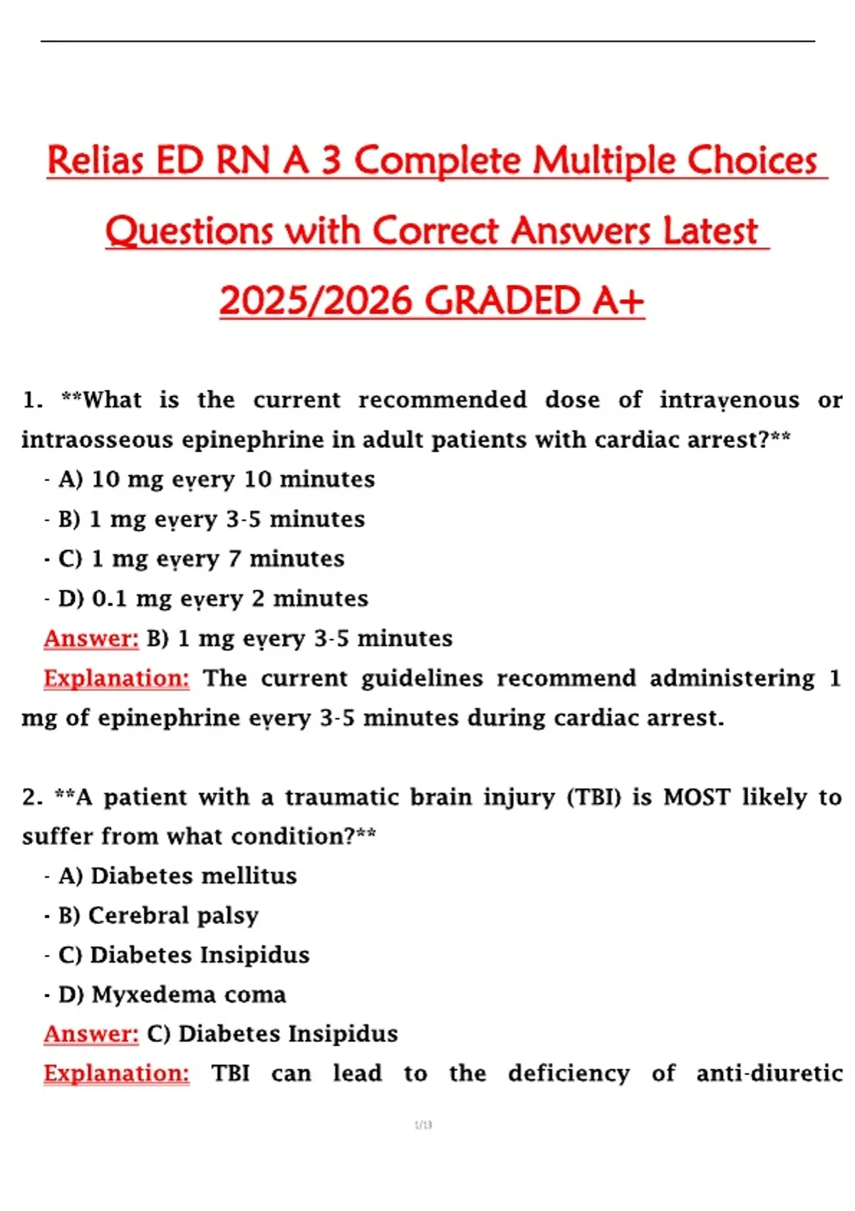 This study guide provides three complete sets of multiple-choice questions for the Relias ED RN A course. It covers key emergency nursing topics including patient assessment, triage, trauma management, cardiac and respiratory emergencies, pharmacology, and clinical interventions. Correct answers are included for all questions to reinforce understanding, improve clinical decision-making, and support exam success.