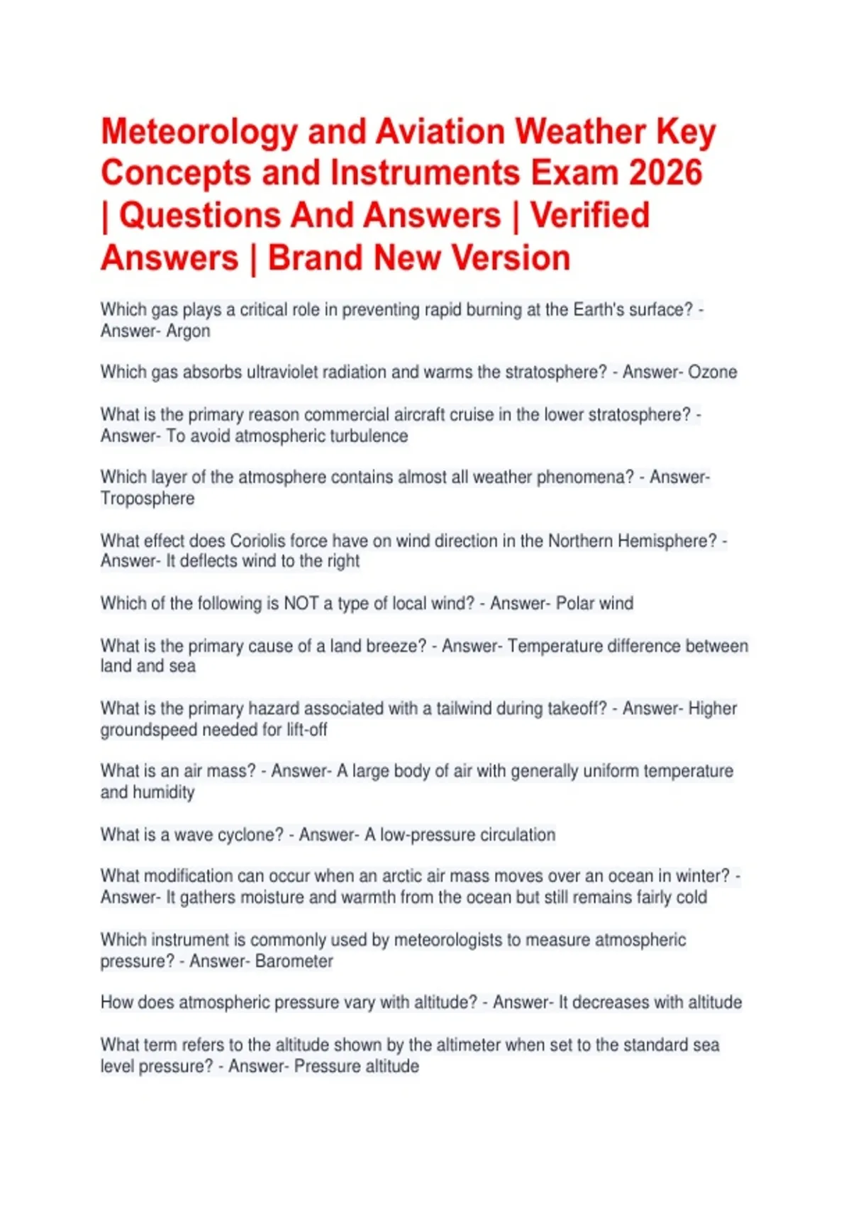 Meteorology and Aviation Weather Key Concepts and Instruments Exam 2026 | Questions And Answers | Verified Answers | Brand New Version Which gas plays a critical role in preventing rapid burning at the Earth's surface? - Answer- Argon Which gas absorbs ultraviolet radiation and warms the stratosphere? - Answer- Ozone What is the primary reason commercial aircraft cruise in the lower stratosphere? - Answer- To avoid atmospheric turbulence Which layer of the atmosphere contains almost all weather phenomena? - Answer- Troposphere What effect does Coriolis force have on wind direction in the Northern Hemisphere? - Answer- It deflects wind to the right Which of the following is NOT a type of local wind? - Answer- Polar wind What is the primary cause of a land breeze? - Answer- Temperature difference between land and sea What is the primary hazard associated with a tailwind during takeoff? - Answer- Higher groundspeed needed for lift-off What is an air mass? - Answer- A large body of air with generally uniform temperature and humidity What is a wave cyclone? - Answer- A low-pressure circulation What modification can occur when an arctic air mass moves over an ocean in winter? - Answer- It gathers moisture and warmth from the ocean but still remains fairly cold Which instrument is commonly used by meteorologists to measure atmospheric pressure? - Answer- Barometer How does atmospheric pressure vary with altitude? - Answer- It decreases with altitude What term refers to the altitude shown by the altimeter when set to the standard sea level pressure? - Answer- Pressure altitude Which substance has the highest thermal conductivity? - Answer- Silver What best defines specific heat capacity? - Answer- The amount of heat energy required to raise the temperature of a substance by one degree Which temperature scale is commonly used in meteorology? - Answer- Celsius What causes the variation in the speed of jet streams? - Answer- Temperature fluctuations What influences the shifting of jet streams northward or southward? - Answer- Seasonal changes and the position of the Sun Why does the equator become very hot in a non-rotating Earth circulation system? - Answer- Because of the direct impact of the Sun's heat At what altitude does a saturated air parcel become a cloud? - Answer- Lifted condensation level Which type of cloud typically forms above 20,000 ft and is composed of ice crystals? - Answer- Cirri-form What is the lapse rate for a rising, unsaturated parcel of air? - Answer- 9.8°C per 1,000 feet At what latitude does the balance between incoming solar radiation and outgoing terrestrial radiation occur? - Answer- 35° latitude Which component absorbs the highest percentage of incoming solar radiation? - Answer- Earth's surface What phenomenon is responsible for the warmest days occurring after the summer solstice? - Answer- Season temperature variation What process describes the movement of water into the ground from the surface? - Answer- Infiltration What is the primary purpose of transpiration in plants? - Answer- Cooling the plant. What factor primarily controls the rate of evaporation from the ocean? - Answer- Solar radiation. What is the latent heat of vaporization of water? - Answer- Depends on the temperature. How is atmospheric stability evaluated using an air parcel? - Answer- By comparing its density to the surrounding air as it is lifted. How does wind affect atmospheric stability? - Answer- Wind increases stability when colder air is blown into the bottom of the air column. What process causes a column of air in the atmosphere to become more stable when it descends? - Answer- Compression by weight of the atmosphere. What distinguishes convective clouds and precipitation from stratiform clouds and precipitation? - Answer- Atmospheric stability. What is the typical thickness of clouds when significant precipitation occurs? - Answer- At least 4,000 feet. Which region in the United States is known for hail occurrences? - Answer- Great plains region east of the Rocky Mountains. When does freezing rain occur? - Answer- When there is a temperature inversion with above-freezing temperatures aloft and below-freezing temperatures at the surface. What is the most common type of thunderstorm in the central and eastern United States during spring and autumn? - Answer- Multicell thunderstorm.