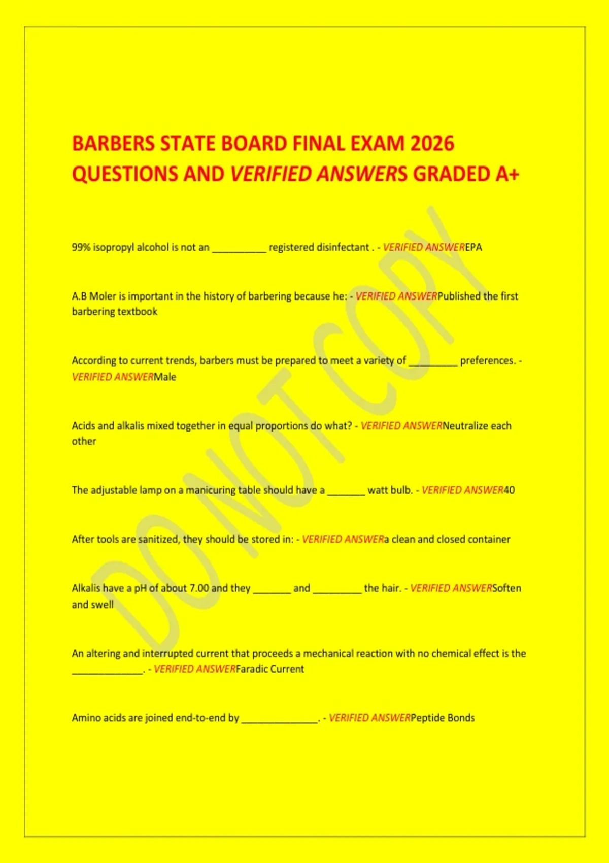BARBERS STATE BOARD FINAL EXAM 2026 QUESTIONS AND VERIFIED ANSWERS GRADED A+