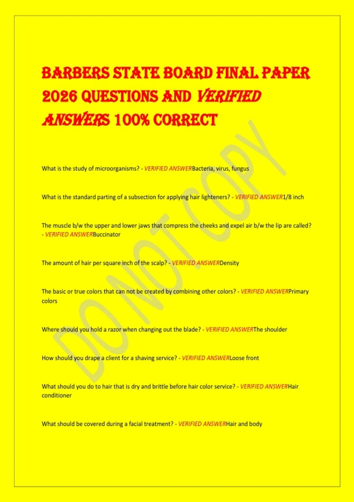 BARBERS STATE BOARD FINAL PAPER 2026 QUESTIONS AND VERIFIED ANSWERS 100% CORRECT