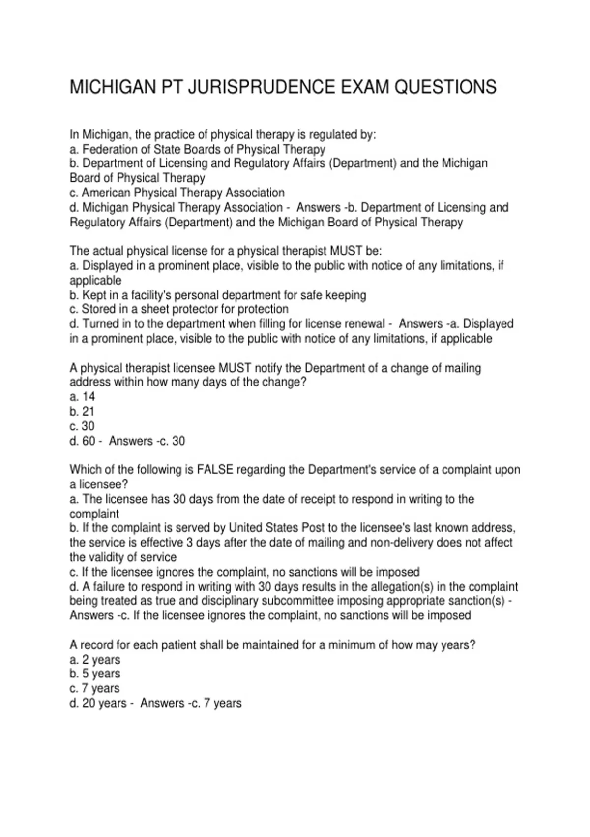 MICHIGAN PT JURISPRUDENCE EXAM QUESTIONS