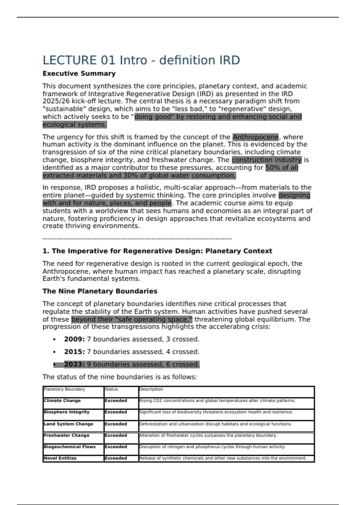 This English summary covers all IRD lectures, clearly and to the point, for ease. Key concepts and project examples from each lecture are included. Everything is written, with extra detail only where needed to support understanding or explain more complex ideas. Included lectures: Lecture 01 – Introduction to Integrative Regenerative Design Lecture 02 – Bio-Regions Lecture 03 – Urban Systems Lecture 04 – Buildings Lecture 05 – Circular Design Lecture 06 – Living Architecture Lecture 07 – Bio-Based Materials Lecture 08 – Geo-based Materials Lecture 09 – The Structure Lecture 10 – The Skin Lecture 11 – The Services Lecture 12 – The Indoor Spaces.
