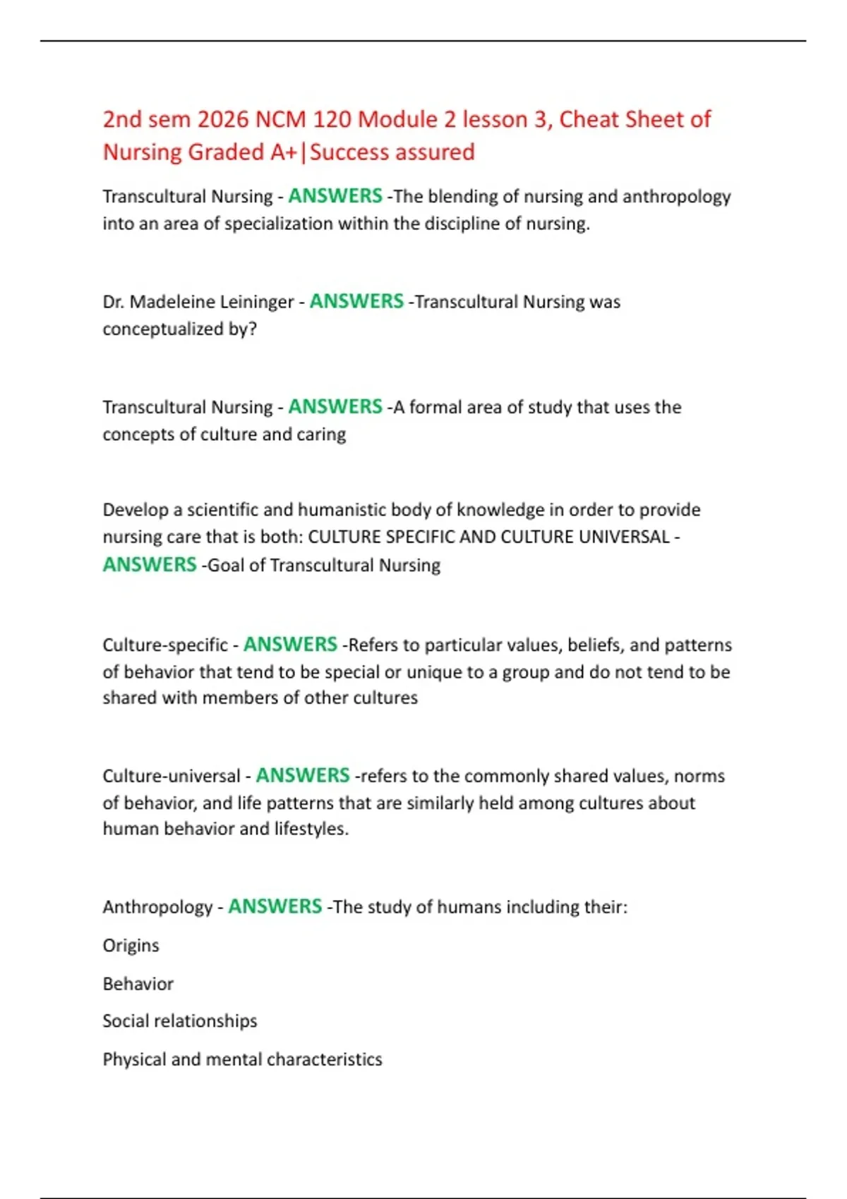 Transcultural Nursing - ANSWERS -The blending of nursing and anthropology