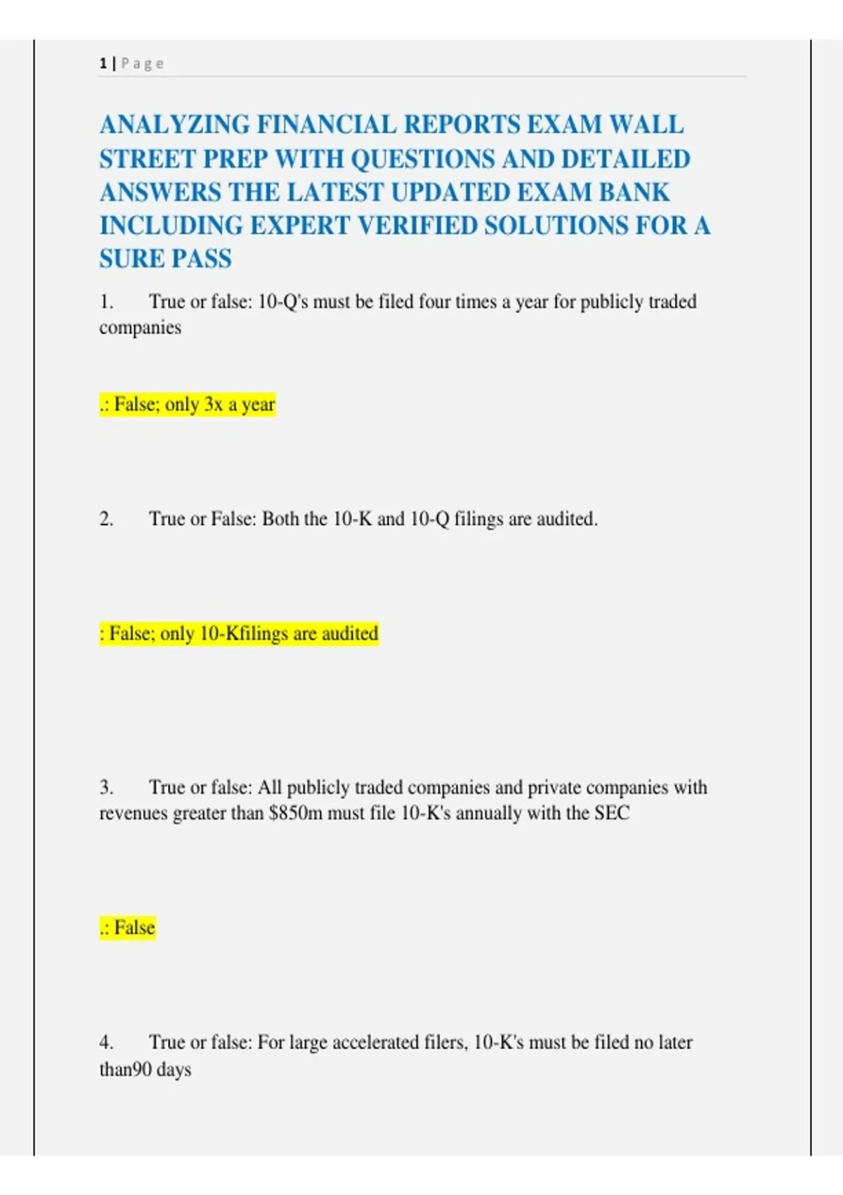 1. True or false: 10-Q's must be filed four times a year for publicly traded