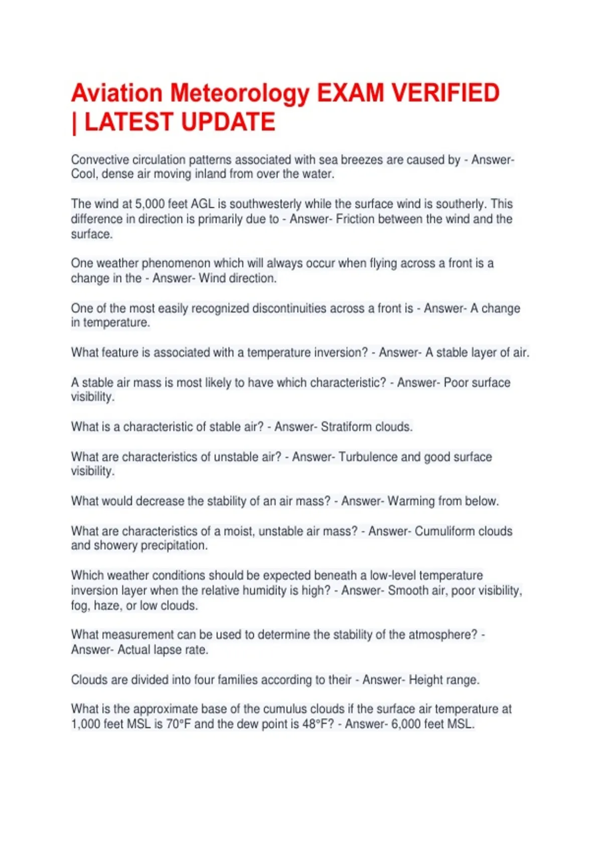 Aviation Meteorology EXAM VERIFIED | LATEST UPDATE Convective circulation patterns associated with sea breezes are caused by - Answer- Cool, dense air moving inland from over the water. The wind at 5,000 feet AGL is southwesterly while the surface wind is southerly. This difference in direction is primarily due to - Answer- Friction between the wind and the surface. One weather phenomenon which will always occur when flying across a front is a change in the - Answer- Wind direction. One of the most easily recognized discontinuities across a front is - Answer- A change in temperature. What feature is associated with a temperature inversion? - Answer- A stable layer of air. A stable air mass is most likely to have which characteristic? - Answer- Poor surface visibility. What is a characteristic of stable air? - Answer- Stratiform clouds. What are characteristics of unstable air? - Answer- Turbulence and good surface visibility. What would decrease the stability of an air mass? - Answer- Warming from below. What are characteristics of a moist, unstable air mass? - Answer- Cumuliform clouds and showery precipitation. Which weather conditions should be expected beneath a low-level temperature inversion layer when the relative humidity is high? - Answer- Smooth air, poor visibility, fog, haze, or low clouds. What measurement can be used to determine the stability of the atmosphere? - Answer- Actual lapse rate. Clouds are divided into four families according to their - Answer- Height range. What is the approximate base of the cumulus clouds if the surface air temperature at 1,000 feet MSL is 70°F and the dew point is 48°F? - Answer- 6,000 feet MSL. At approximately what altitude above the surface would the pilot expect the base of cumuliform clouds if the surface air temperature is 82°F and the dew point is 38°F? - Answer- 10,000 feet AGL. When warm, moist, stable air flows upslope, it - Answer- Produces stratus-type clouds. The suffix "nimbus," used in naming clouds, means - Answer- A rain cloud. If an unstable air mass is forced upward, what type clouds can be expected? - Answer- Clouds with considerable vertical development and associated turbulence. The conditions necessary for the formation of cumulonimbus clouds are a lifting action and - Answer- Unstable, moist air. Steady precipitation preceding a front is an indication of - Answer- Stratiform clouds with little or no turbulence. A pilot can expect a wind shear zone in a temperature inversion whenever the windspeed at 2,000 to 4,000 feet above the surface is at least - Answer- 25 knots. When may hazardous wind shear be expected? - Answer- In areas of low-level temperature inversion, frontal zones, and clear air turbulence. Where does wind shear occur? - Answer- At all altitudes, in all directions The amount of water vapor which air can hold depends on the - Answer- air temperature Clouds, fog, or dew will always form when - Answer- water vapor condenses What should pilots state initially when telephoning Flight Service for preflight weather information? - Answer- The intended route of flight and destination Every physical process of weather is accompanied by, or is the result of, a - Answer- heat exchange What causes variations in altimeter settings between weather reporting points? - Answer- Unequal heating of the Earth's surface When there is a temperature inversion, you would expect to experience - Answer- an increase in temperature as altitude increases The most frequent type of ground or surface-based temperature inversion is that which is produced by - Answer- terrestrial radiation on a clear, relatively still night
