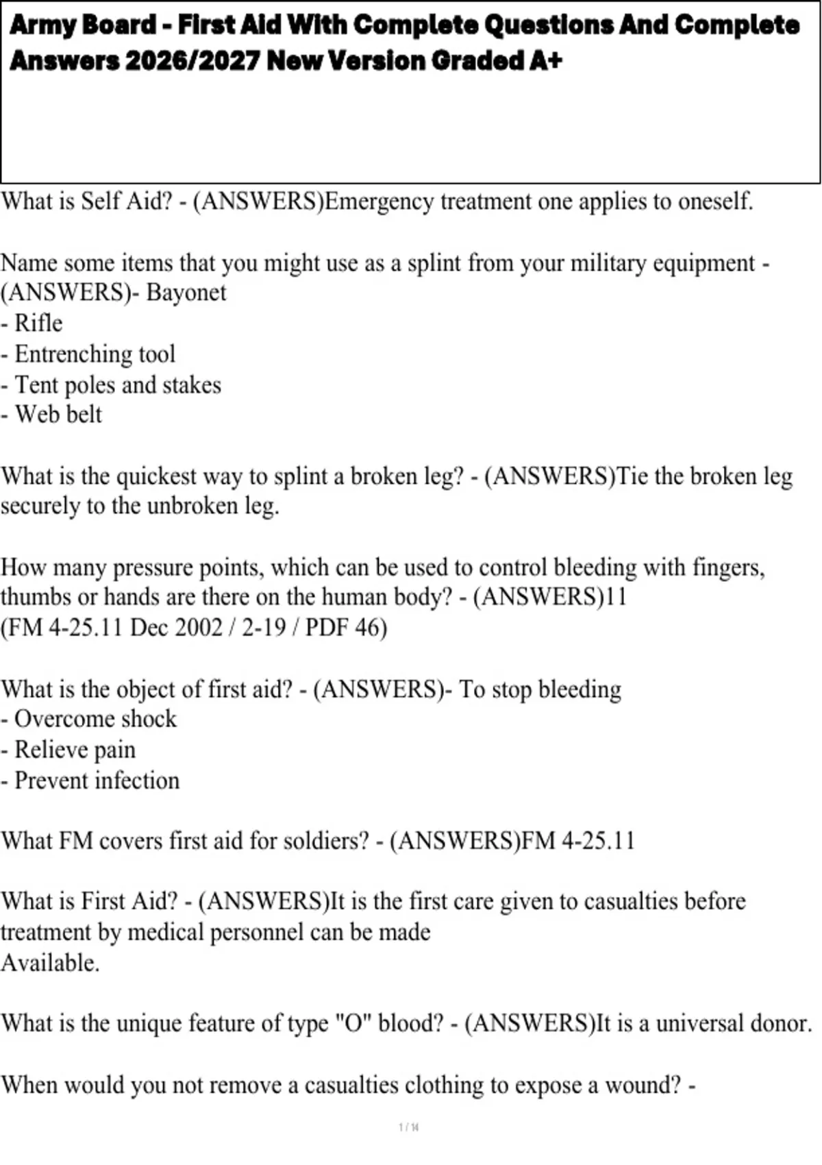 Army Board - First Aid With Complete Questions And Complete Answers 2026/2027 New Version Graded A+