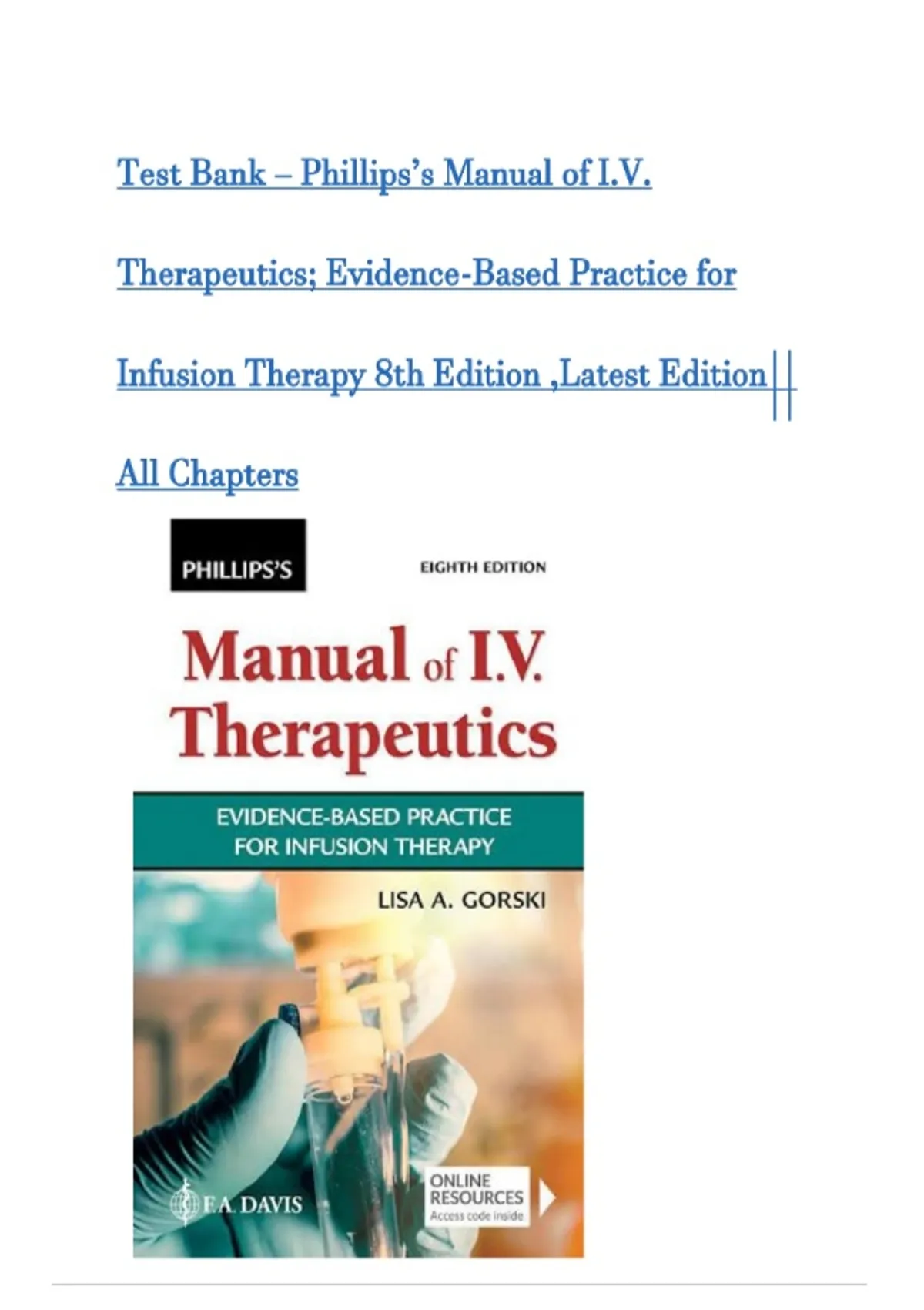 Test Bank - Phillips’s Manual of I.V. Therapeutics; Evidence-Based Practice for Infusion Therapy 8th Edition (Lisa Gorski , 2026) ,Latest Edition|| All Chapters