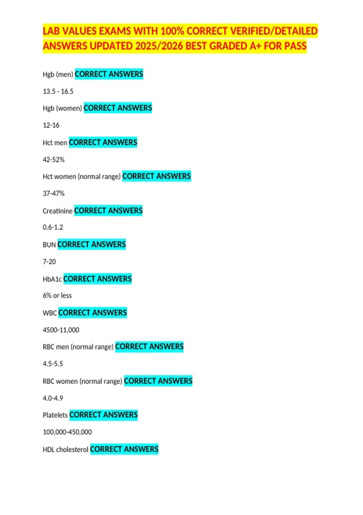 LAB VALUES EXAMS WITH 100% CORRECT VERIFIED/DETAILED ANSWERS UPDATED 2025/2026 BEST GRADED A+ FOR PASS
