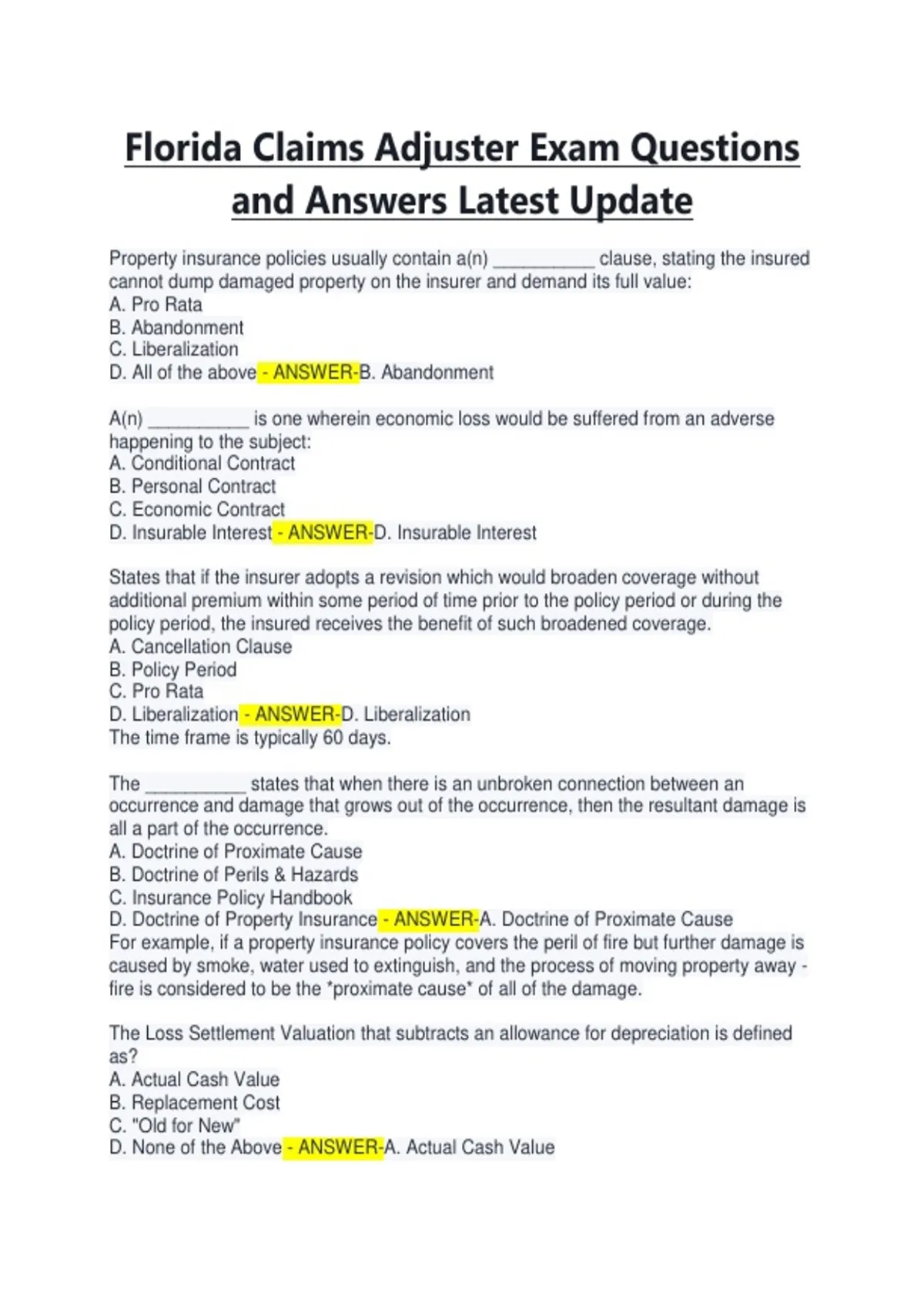 Florida Claims Adjuster Exam Questions and Answers Latest Update.