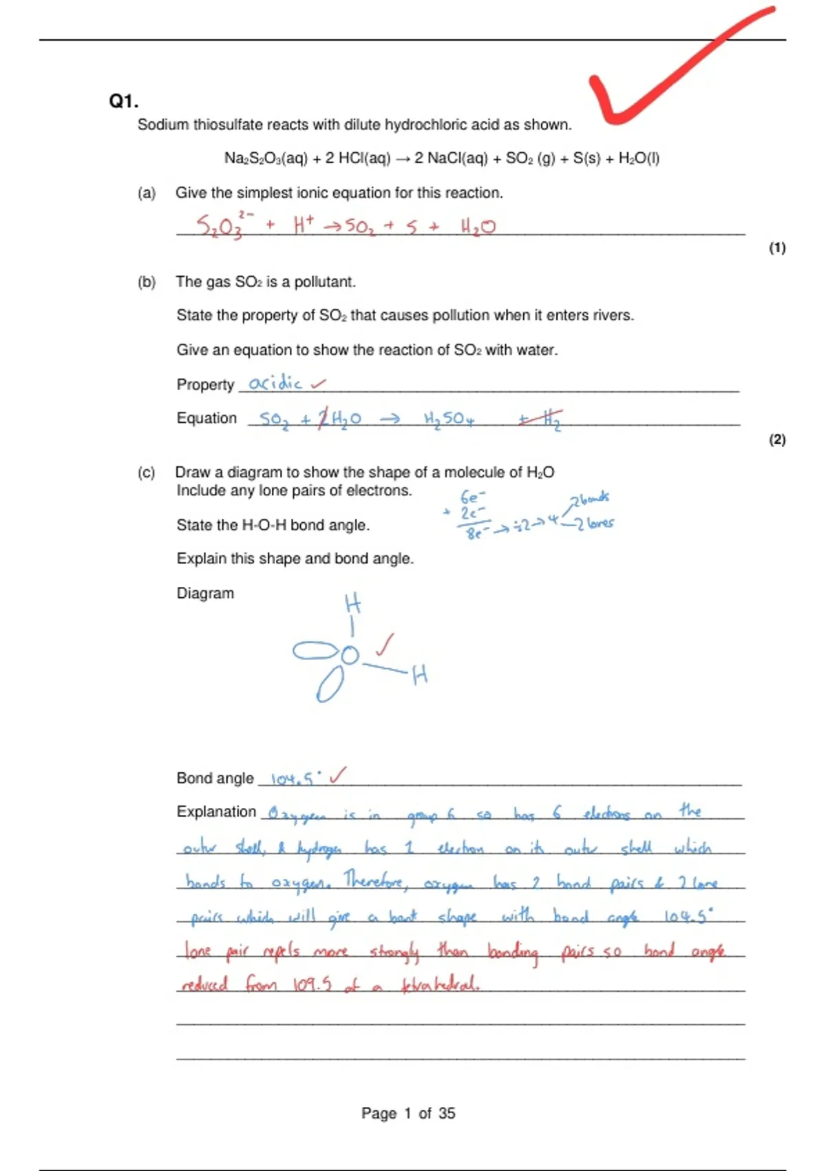 (c) Draw a diagram to show the shape of a molecule of H2O