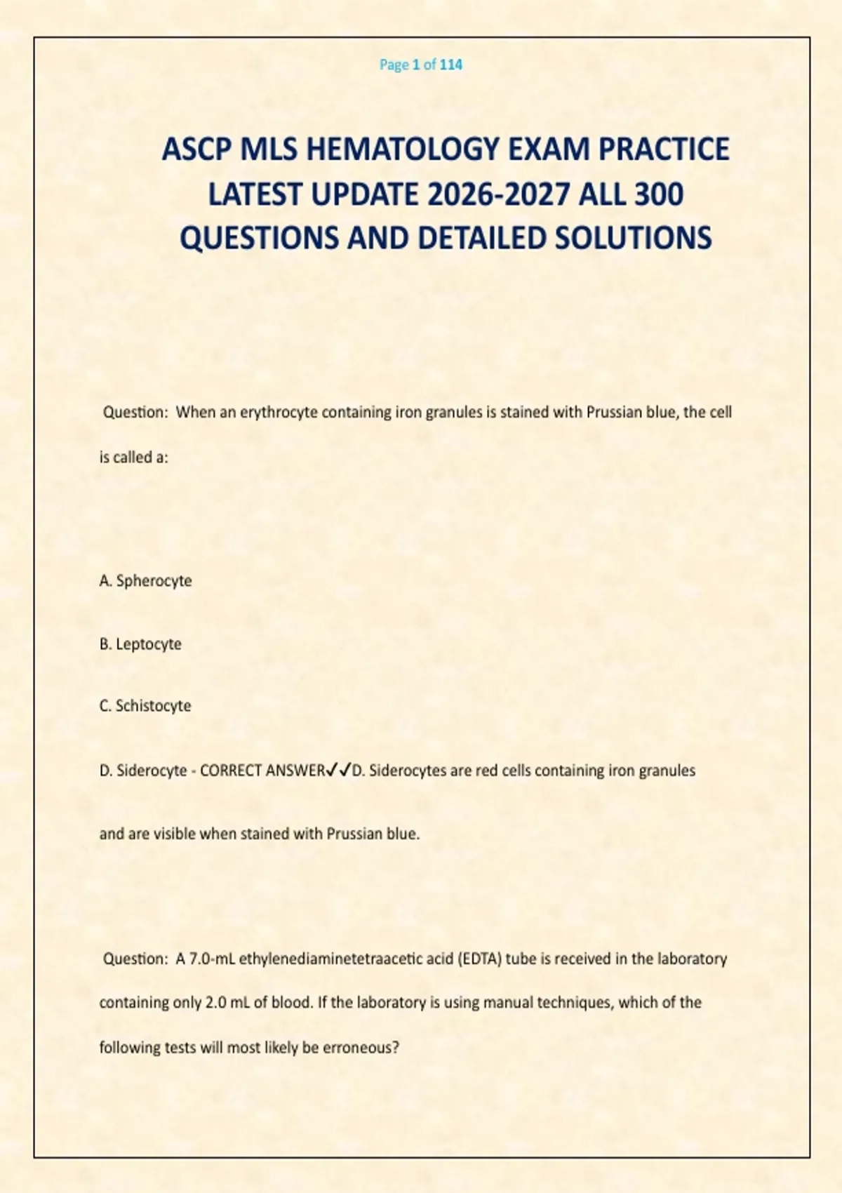 ASCP MLS HEMATOLOGY EXAM PRACTICE LATEST UPDATE ALL 300 QUESTIONS AND DETAILED SOLUTIONS