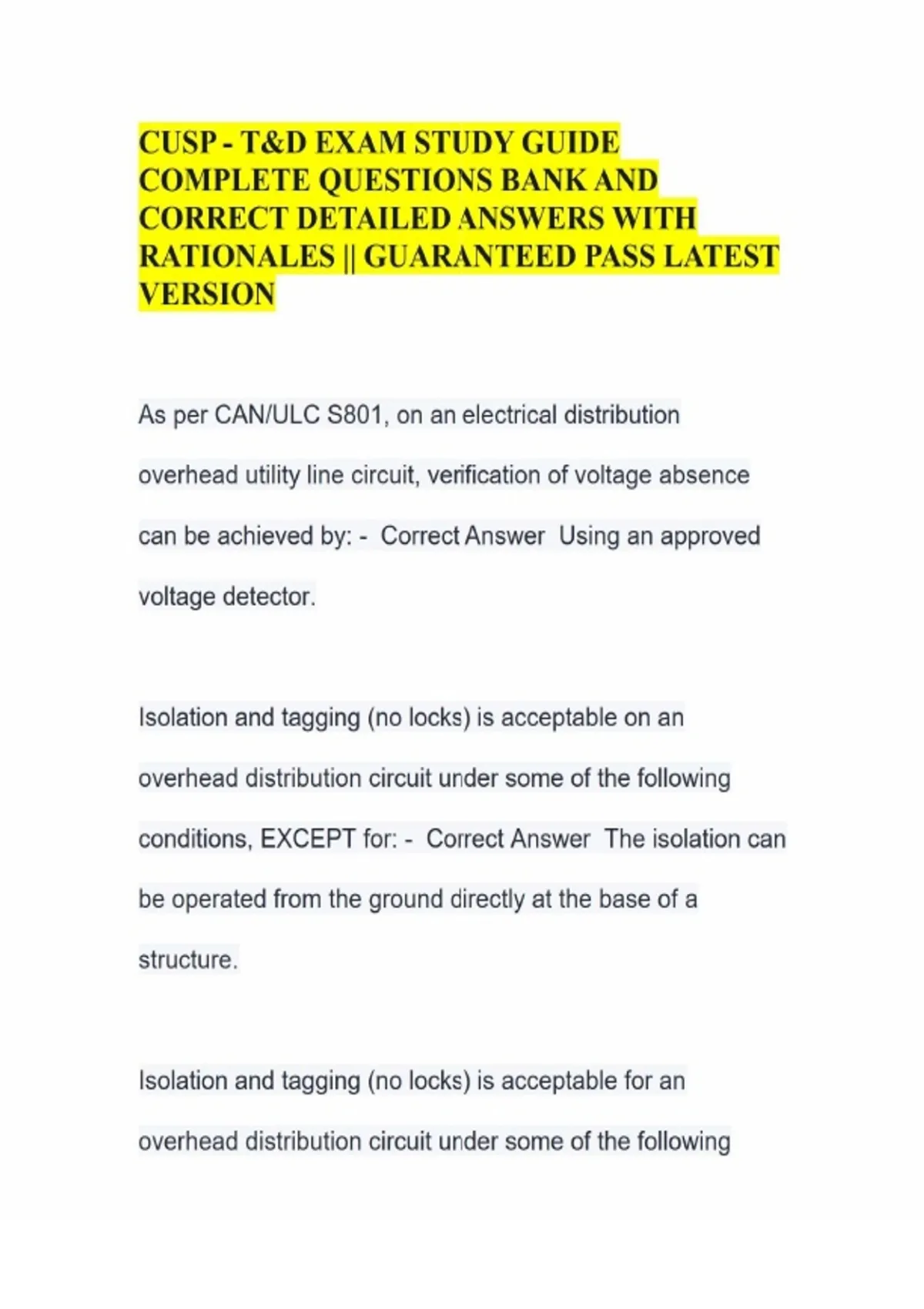 CUSP - T&D EXAM STUDY GUIDE COMPLETE QUESTIONS BANK AND CORRECT DETAILED ANSWERS WITH RATIONALES || GUARANTEED PASS LATEST VERSION