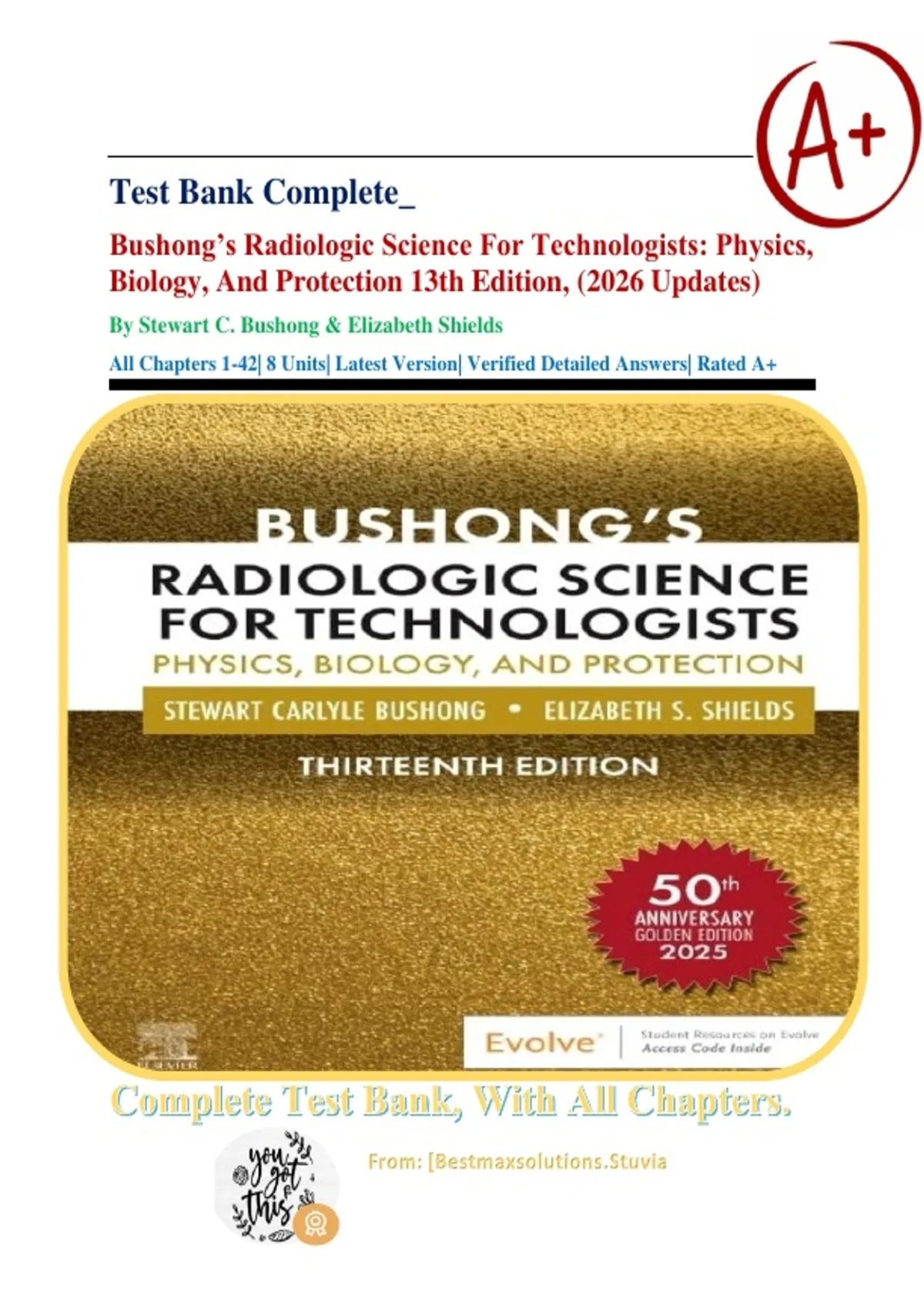 Test Bank Complete_ Bushong’s Radiologic Science For Technologists: Physics, Biology, And Protection 13th Edition, (2026 Updates) By Stewart C. Bushong; All Chapters 1-42| Detailed Answers| Rated A+