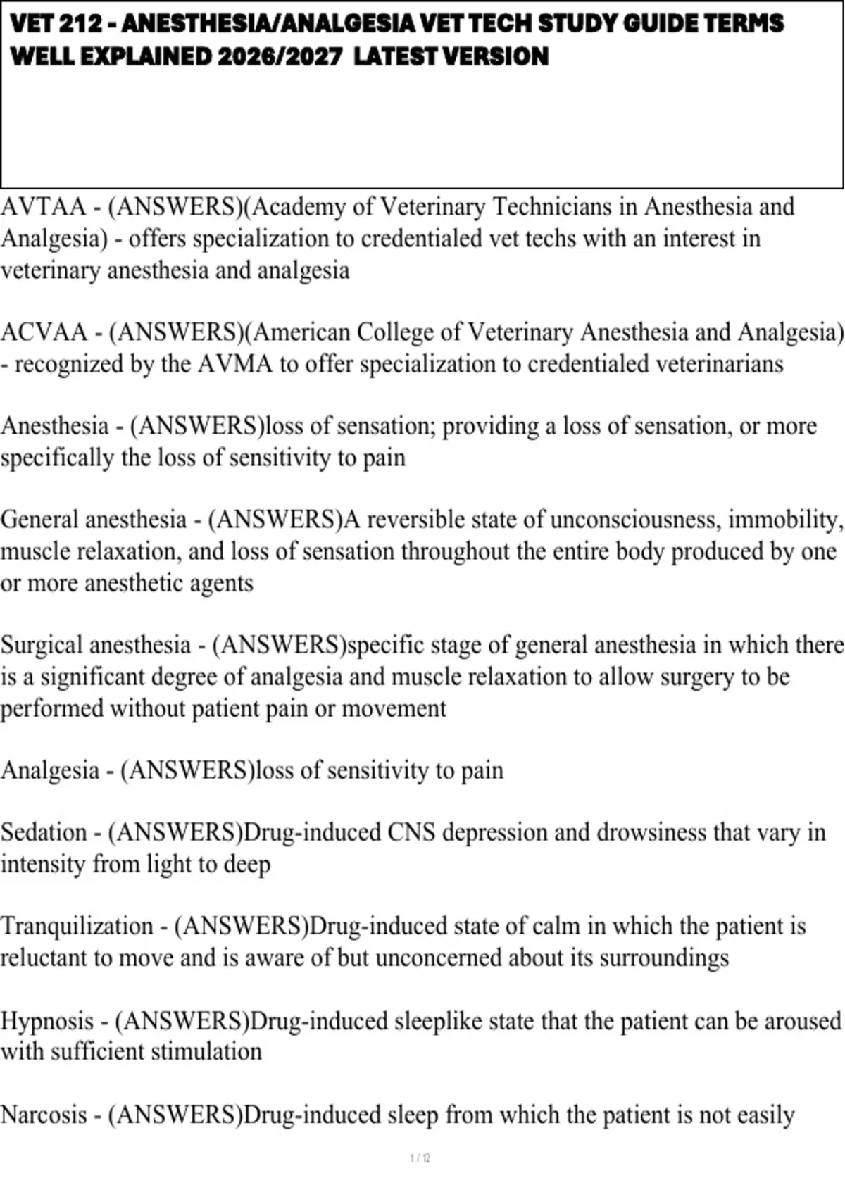 VET 212 - ANESTHESIA/ANALGESIA VET TECH STUDY GUIDE TERMS WELL EXPLAINED 2026/2027 LATEST VERSION