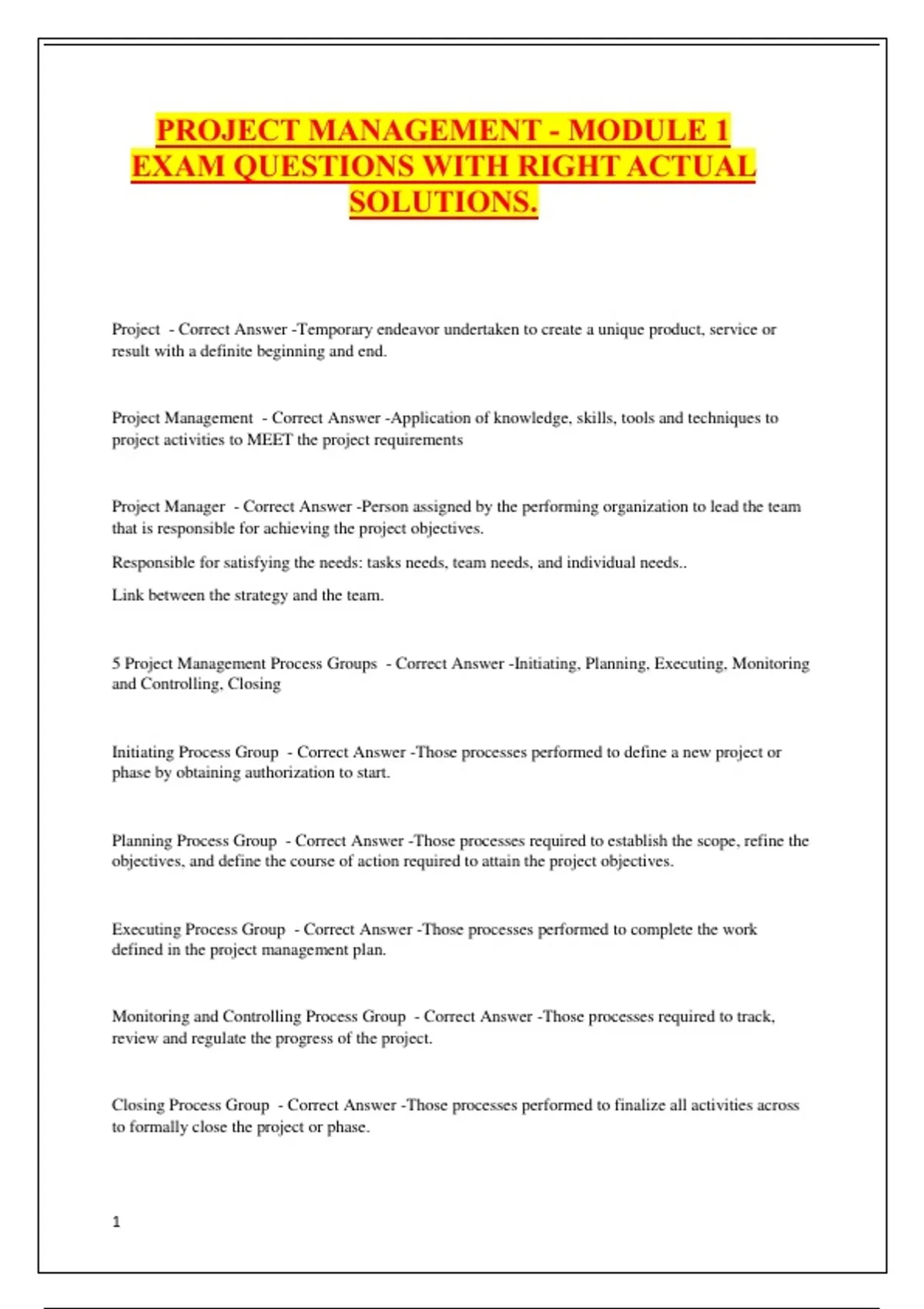 5 Project Management Process Groups - Correct Answer -Initiating, Planning, Executing, Monitoring