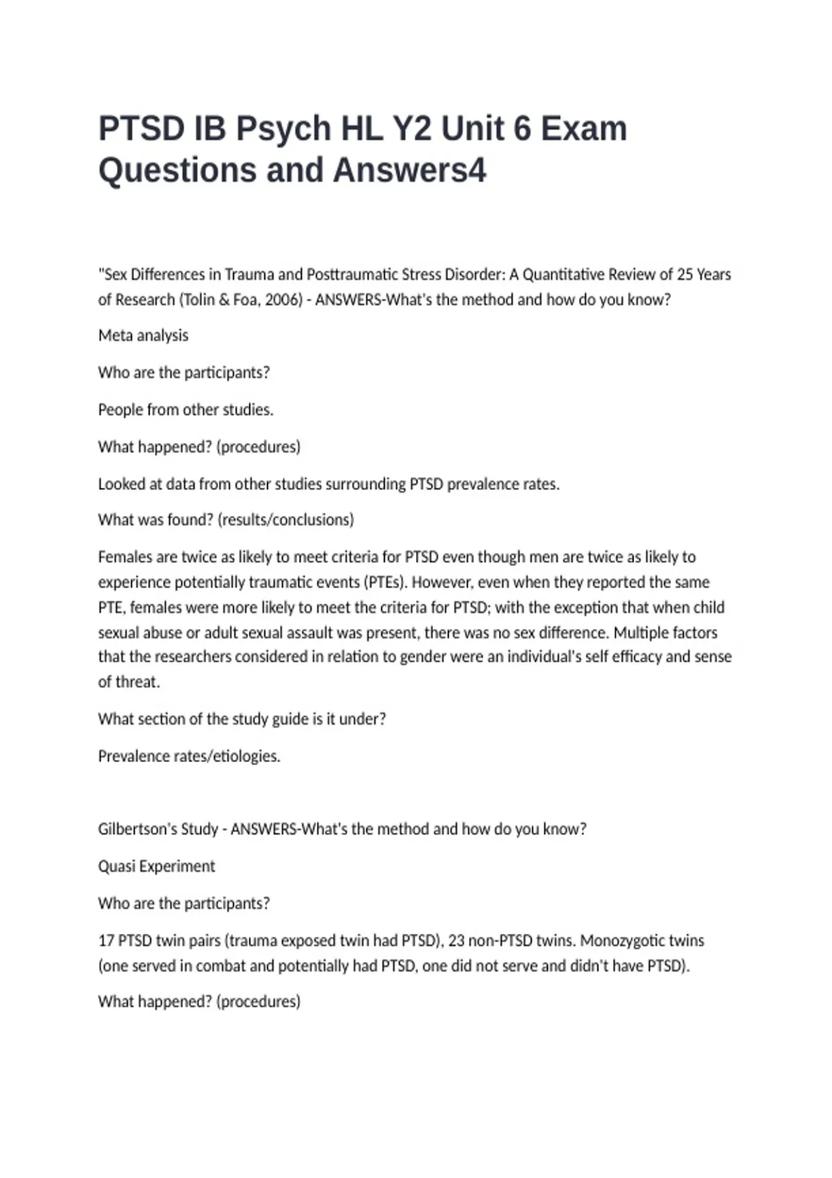 PTSD IB Psych HL Y2 Unit 6 Exam Questions and Answers
