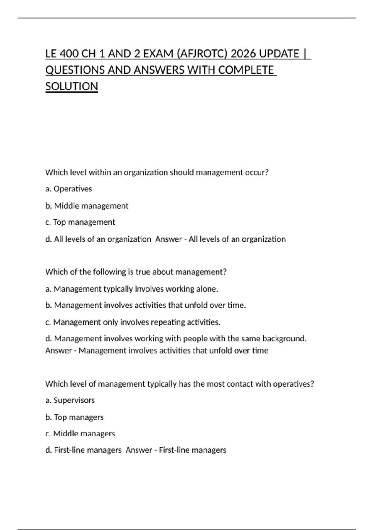LE 400 CH 1 AND 2 EXAM (AFJROTC) 2026 UPDATE | QUESTIONS AND ANSWERS WITH COMPLETE SOLUTION