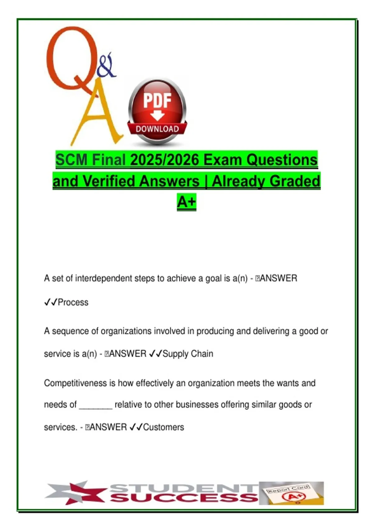 This verified exam review for SCM (Supply Chain Management) Final 2025/2026 contains 100 comprehensive questions and correct answers, providing students with a powerful tool for mastering core SCM concepts. It covers the full spectrum of supply chain knowledge—ranging from process design and capacity planning to lean operations, statistical quality control, forecasting, inventory management, and project scheduling. Key areas include the bullwhip effect, aggregate planning, EOQ assumptions, vendor analysis, constraint management, quality costs (internal, appraisal, external), and lean principles such as muda, Jidoka, Heijunka, and Poka-yoke. The review also explains tools like Pareto analysis, histograms, scatterplots, and control charts, as well as Six Sigma methodologies (DMAIC) and SPC objectives. Students will also gain insights into logistics management, kanban systems, pull vs push systems, and total cost awareness in supply chain strategy. This resource is tailored for students in: – Supply Chain Management – Operations and Logistics – Industrial Engineering and Business Administration – MBA with SCM/Operations focus – Professional certifications such as CPIM, CSCP, CPSM, or SCPro™ Keywords: lean operations, Six Sigma, bullwhip effect, forecasting accuracy, vendor analysis, inventory holding cost, EOQ, quality of conformance, Pareto chart, scatterplot, control chart, muda, Heijunka, Jidoka, Poka-yoke, kanban system, pull system, push system, aggregate planning, statistical process control, DMAIC, total cost, project management