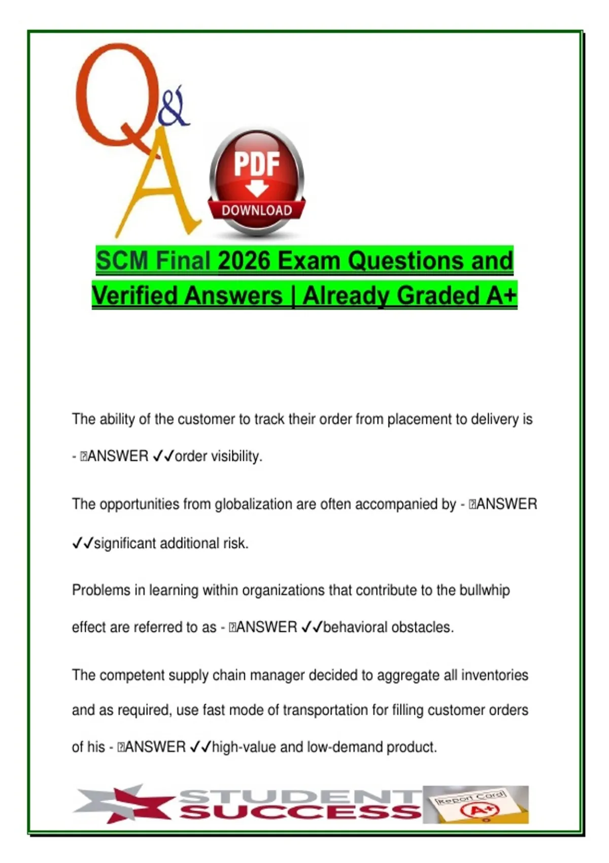 This document contains 80 multiple-choice questions with verified answers for the final exam in Supply Chain Management (SCM), already graded A+. It is structured as a high-quality review tool for students studying supply chain operations, design, and logistics, with a clear emphasis on planning, inventory management, coordination strategies, and risk mitigation. The questions reflect real academic and professional-level assessments and are ideal for preparing for exams or certification tests in operations and supply chain management. Key topics include: Order visibility and customer service Inventory types and lot sizing strategies Bullwhip effect and behavioral obstacles Aggregate planning and production strategies Supply chain design decisions and facility management Logistics costs and transportation networks Globalization risks and supply chain disruptions Coordination mechanisms and contracts (e.g., buyback contracts) Technological impacts such as CPFR and sustainability measures Forecasting error, lead time, and response strategies Each question is answered and verified, providing a reliable framework for self-assessment, final revision, and knowledge reinforcement. This document is highly useful for: Undergraduate and graduate students in Supply Chain Management, Operations, or Logistics MBA students focusing on global supply chains or operations strategy Professionals and certification candidates preparing for CPIM, CSCP, or related SCM credentials Business students enrolled in production, planning, or logistics-related courses Keywords: supply chain, order visibility, bullwhip effect, logistics, inventory planning, CPFR, aggregate planning, lead time, risk management, transportation, global sourcing, supply chain design, facility cost, demand forecasting, flexibility strategy