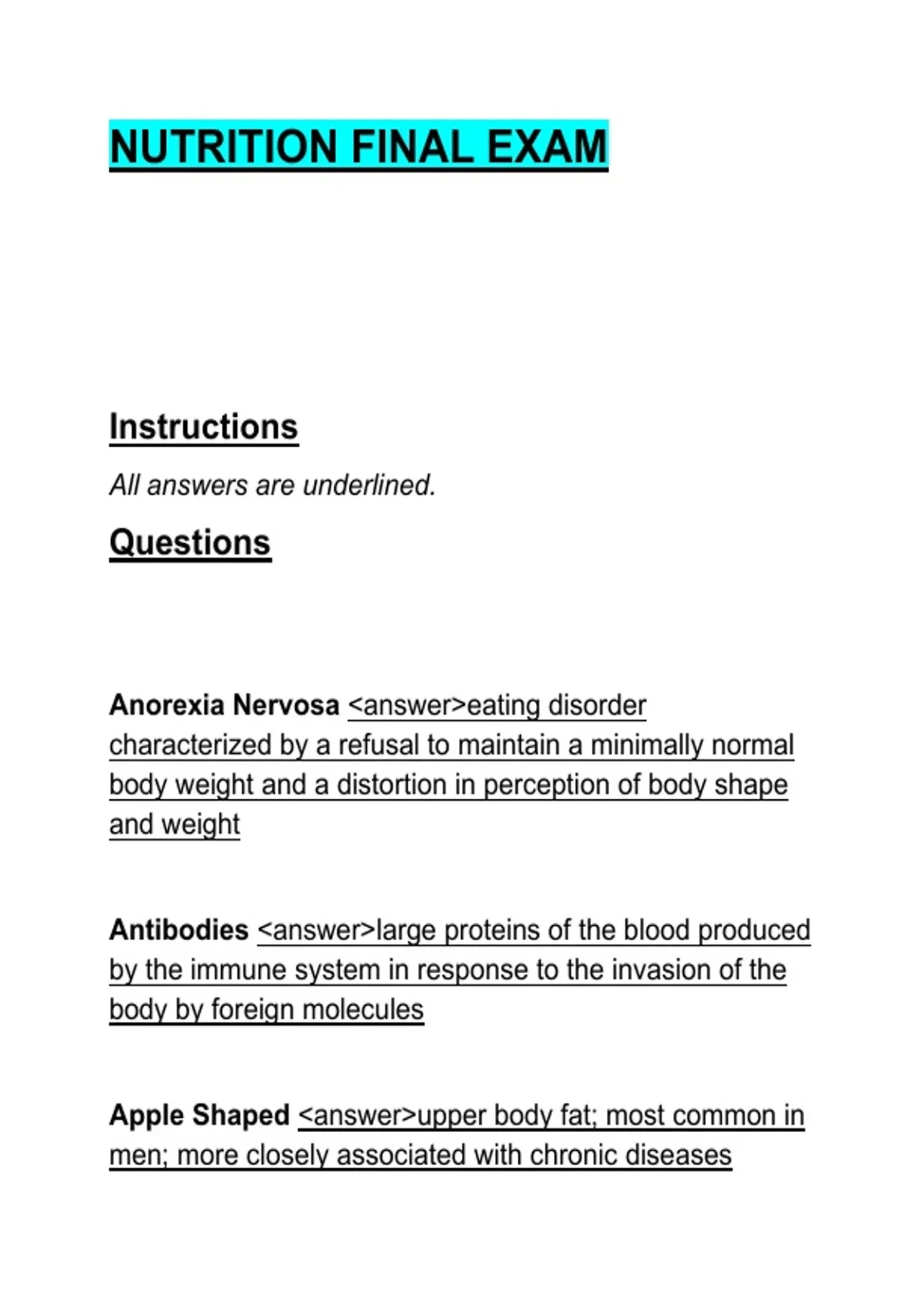 This document contains a complete overview of essential nutrition concepts for a final exam, presented as clearly defined questions and underlined answers. Topics include macronutrient digestion and metabolism, vitamins and minerals, chronic diseases, body composition, weight management, and exercise nutrition. The material is suitable as a last-minute review or a consolidated study guide covering core exam content.