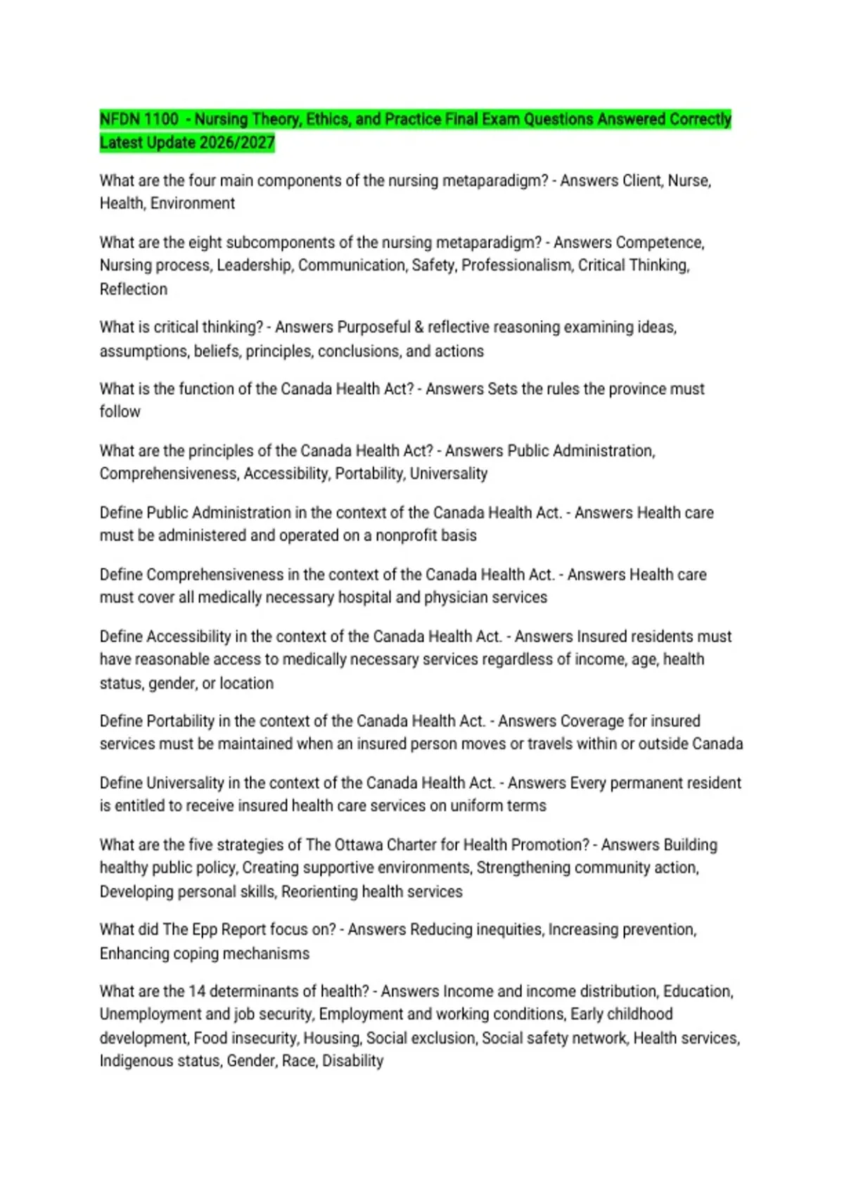 NFDN 1100 - Nursing Theory, Ethics, and Practice Final Exam Questions Answered Correctly Latest Update 2026/2027 What are the four main components of the nursing metaparadigm? - Answers Client, Nurse, Health, Environment What are the eight subcomponents of the nursing metaparadigm? - Answers Competence, Nursing process, Leadership, Communication, Safety, Professionalism, Critical Thinking, Reflection What is critical thinking? - Answers Purposeful & reflective reasoning examining ideas, assumptions, beliefs, principles, conclusions, and actions What is the function of the Canada Health Act? - Answers Sets the rules the province must follow What are the principles of the Canada Health Act? - Answers Public Administration, Comprehensiveness, Accessibility, Portability, Universality Define Public Administration in the context of the Canada Health Act. - Answers Health care must be administered and operated on a nonprofit basis Define Comprehensiveness in the context of the Canada Health Act. - Answers Health care must cover all medically necessary hospital and physician services Define Accessibility in the context of the Canada Health Act. - Answers Insured residents must have reasonable access to medically necessary services regardless of income, age, health status, gender, or location Define Portability in the context of the Canada Health Act. - Answers Coverage for insured services must be maintained when an insured person moves or travels within or outside Canada Define Universality in the context of the Canada Health Act. - Answers Every permanent resident is entitled to receive insured health care services on uniform terms What are the five strategies of The Ottawa Charter for Health Promotion? - Answers Building healthy public policy, Creating supportive environments, Strengthening community action, Developing personal skills, Reorienting health services What did The Epp Report focus on? - Answers Reducing inequities, Increasing prevention, Enhancing coping mechanisms What are the 14 determinants of health? - Answers Income and income distribution, Education, Unemployment and job security, Employment and working conditions, Early childhood development, Food insecurity, Housing, Social exclusion, Social safety network, Health services, Indigenous status, Gender, Race, Disability What are the three levels of health care? - Answers Primary, Secondary, Tertiary What is primary health care? - Answers First contact of a client with the health care system, including physicians and NPs What is secondary health care? - Answers Specialized care provided by a physician related to diagnosis What is tertiary health care? - Answers Specialized, technical care for diagnosis and treatment How is nursing defined? - Answers A profession committed to public service requiring specialized knowledge and high responsibility Who is known as the founder of professional nursing? - Answers Florence Nightingale Where was the first nursing school in Canada? - Answers St. Catherine's, 1874 Who was responsible for educational reform of nursing in Canada? - Answers Mary Agnes Snively What is nursing theory? - Answers A conceptualization of some aspect of nursing that describes, predicts, explains, and prescribes nursing care What are the four components of nursing theory? - Answers Phenomenon, Concepts, Operational definition, Assumptions What are the five different types of nursing theories? - Answers Practice-based, Needs, Interactionist, Simultaneity, Systems What does growth encompass? - Answers Physical changes across a person's lifespan What does development include? - Answers Biological, cognitive, and socio-emotional factors What is moral reasoning? - Answers How individuals view the rules of ethical or moral conduct What is moral development? - Answers The ability to distinguish between right and wrong What is theory? - Answers That which explains a phenomenon. What are the 4 components of nursing theory? - Answers Phenomenon, concepts, operational definition, assumptions. What is a phenomenon in nursing theory? - Answers An aspect of reality that can be consciously sensed or experienced. What are concepts in nursing theory? - Answers Something formed in the mind. What is an operational definition in nursing theory? - Answers Concepts applied to decision making in practice, linking concepts with theories. What are assumptions in nursing theory? - Answers Descriptions of concepts that are accepted as factual or 'taken for granted'. What are the 5 different types of nursing theories? - Answers Practice-based, needs, interactionist, simultaneity, systems. What characterizes practice-based nursing theories? - Answers Derived directly from the practice setting, reflecting issues shaping the role and context of nursing. What is the needs theory in nursing? - Answers The client is represented as a collection of