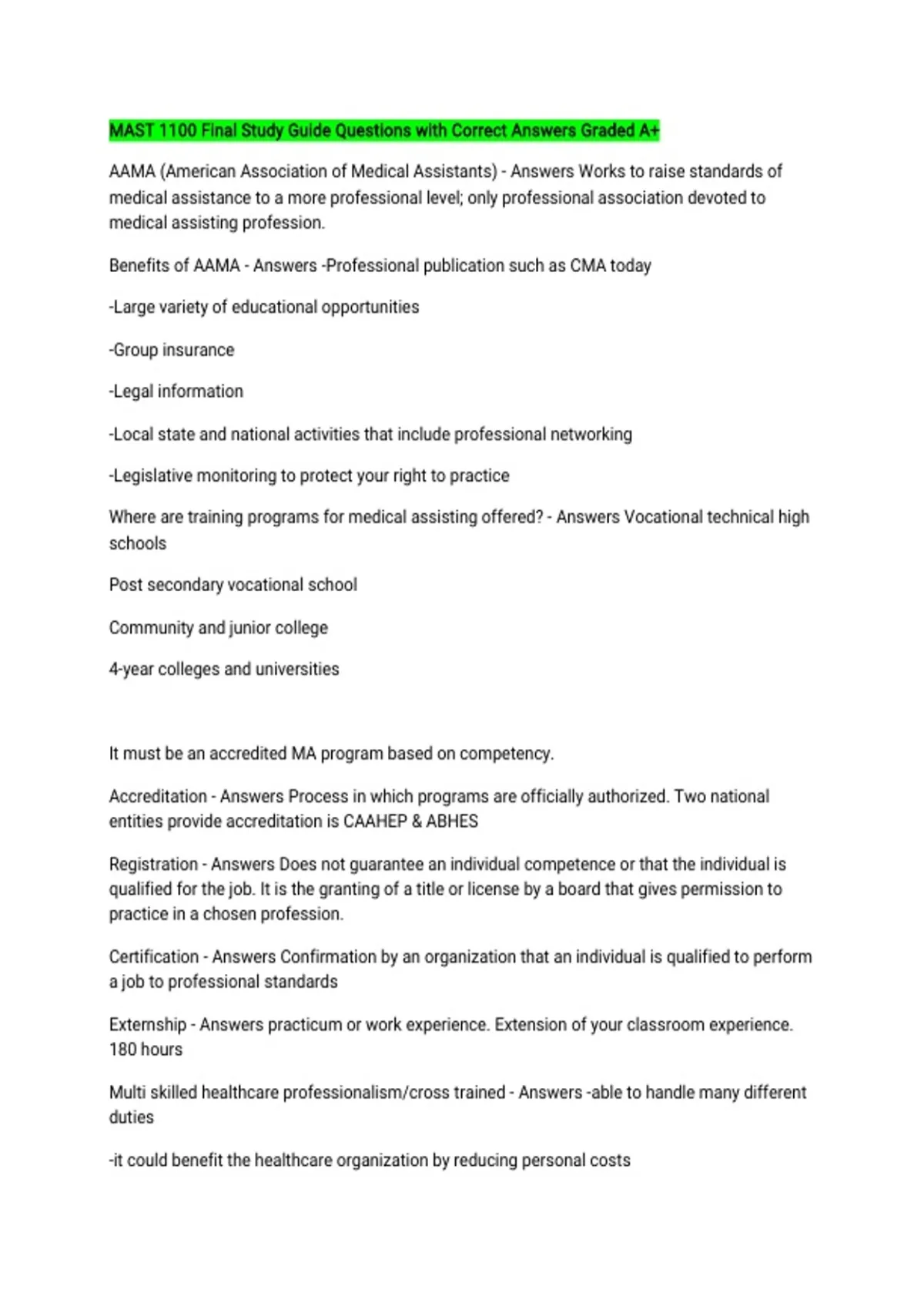MAST 1100 Final Study Guide Questions with Correct Answers Graded A+ AAMA (American Association of Medical Assistants) - Answers Works to raise standards of medical assistance to a more professional level; only professional association devoted to medical assisting profession. Benefits of AAMA - Answers -Professional publication such as CMA today -Large variety of educational opportunities -Group insurance -Legal information -Local state and national activities that include professional networking -Legislative monitoring to protect your right to practice Where are training programs for medical assisting offered? - Answers Vocational technical high schools Post secondary vocational school Community and junior college 4-year colleges and universities It must be an accredited MA program based on competency. Accreditation - Answers Process in which programs are officially authorized. Two national entities provide accreditation is CAAHEP & ABHES Registration - Answers Does not guarantee an individual competence or that the individual is qualified for the job. It is the granting of a title or license by a board that gives permission to practice in a chosen profession. Certification - Answers Confirmation by an organization that an individual is qualified to perform a job to professional standards Externship - Answers practicum or work experience. Extension of your classroom experience. 180 hours Multi skilled healthcare professionalism/cross trained - Answers -able to handle many different duties -it could benefit the healthcare organization by reducing personal costs -can perform the functions of two or more people -cost effective employees and high demand Primary Care Physician (PCP) - Answers -AKA Family practitioner -who oversees a patient healthcare Scope of practice of a MA & who regulates it? - Answers Set of procedures that can be performed. Regulates by state (LA) law Board certified physician - Answers A licensed practitioner who has obtained education and licensing for 9 to 12 years and taken multiple tests known as board tests. Allergists - Answers diagnose and treat physical reactions to substances such as mold, dust, fur, and pollen. Immunologist - Answers Treat immune deficiency diseases and problems related to autoimmune disease, organ transplantation, or malignancies of the immune system Anesthesiologist - Answers Use medications that cause patients to lose sensation, or feeling during surgery. Also called an MD or DO. Cardiologist - Answers Diagnose and treat cardiovascular diseases of the heart and blood vessels. Reads ECG's which are sometimes called an EKG Colon and rectal surgery - Answers Diagnose and treat conditions related to the colon such as hemmoroids, fissures (painful tears in the anal lining) and abscesses. Dermatology - Answers Diagnose and treat diseases of the skin, hair, and mucous membranes. Emergency medicine - Answers Diagnose and treat patients with conditions resulting from an unexpected medical crisis or accident and focus on immediate decision making and action necessary to prevent death or any other further disability. Endocrinology - Answers They treat hypothyroidism and disorders of the endocrine system which regulates many body functions Gastroenterology - Answers Diagnose and treat disorders of the gastrointestinal tract including the functioning of the stomach, intestine, and associated organs Genetics and Genomics - Answers Trained to evaluate, diagnose, manage, treat, and counsel individuals of all ages with hereditary disorders Gerentology - Answers study of the aging process; deals with diagnosis and treatment of problems and diseases of the older adult Gynecology - Answers Branch of medicine concerned with diseases and conditions of the female genital tract; examples yeast infection, menstrual irregularities and sexually transmitted infection Internal medicine - Answers Diagnose and treat problems related to the internal organs.