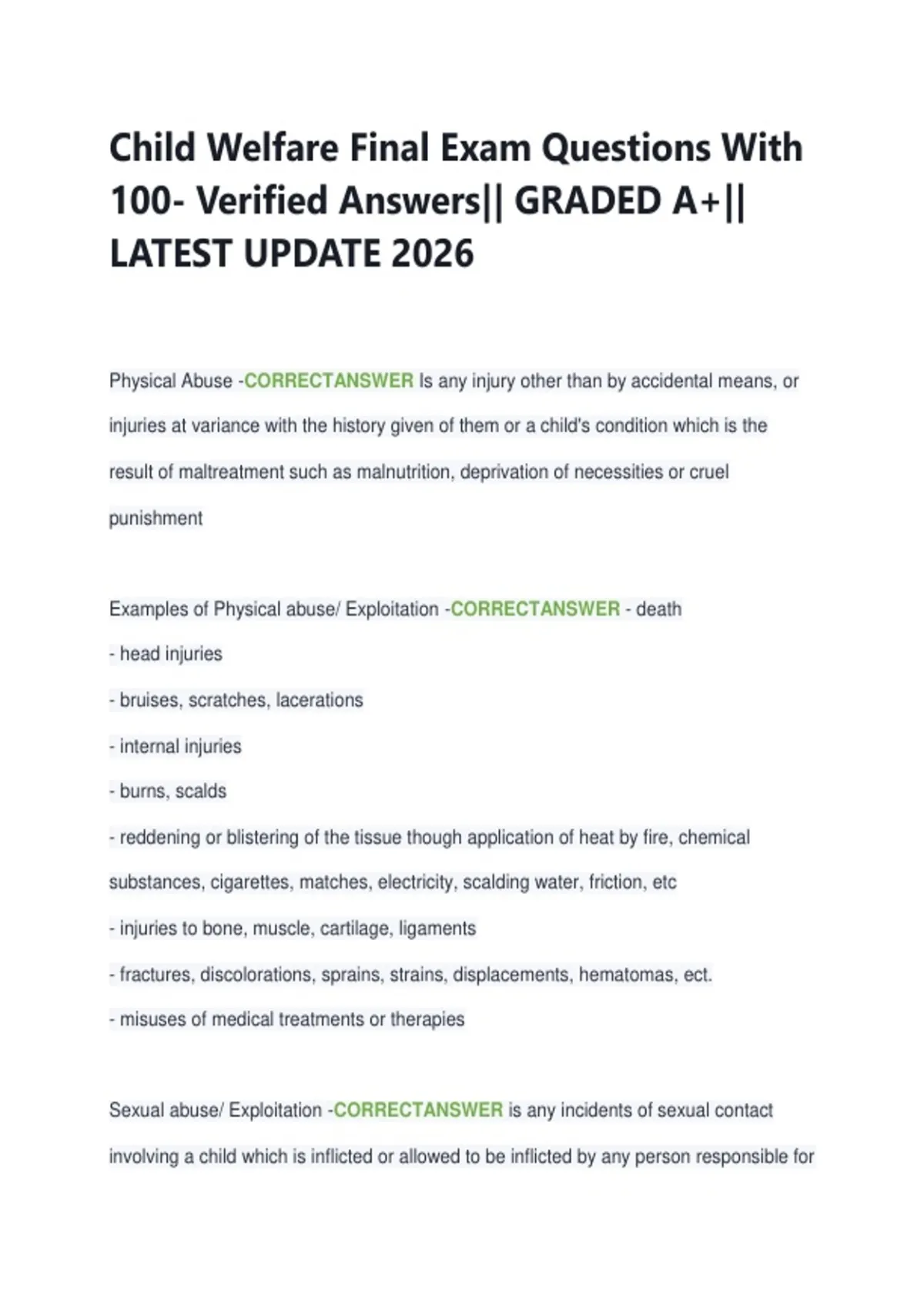 Child Welfare Final Exam Questions With