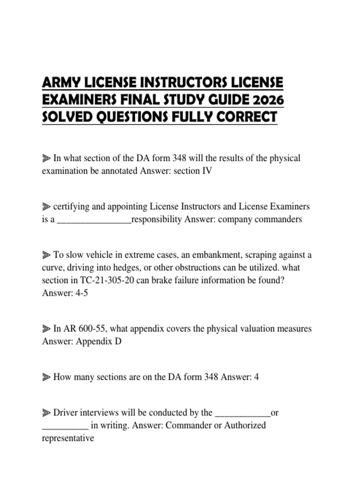 ARMY LICENSE INSTRUCTORS LICENSE EXAMINERS FINAL STUDY GUIDE 2026 SOLVED QUESTIONS FULLY CORRECT