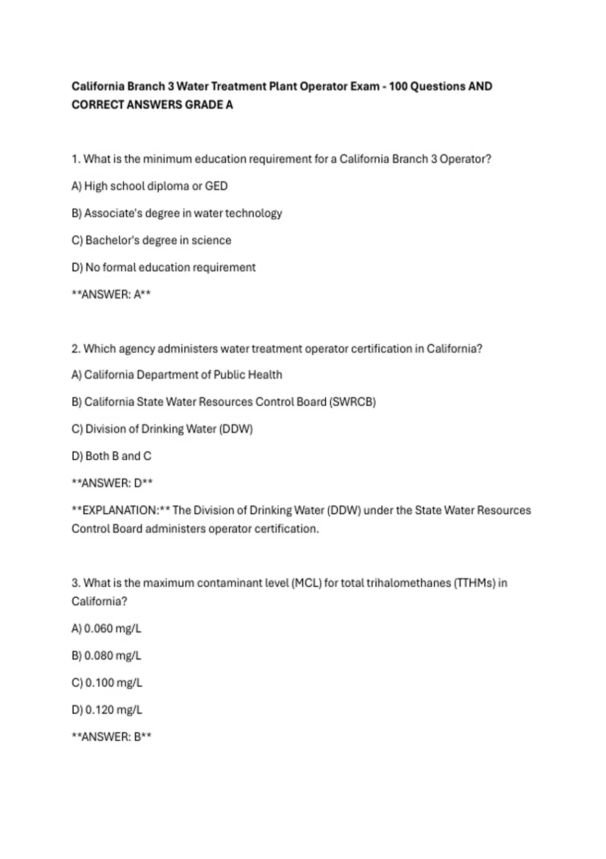 California Branch 3 Water Treatment Plant Operator Exam - 100 Questions AND