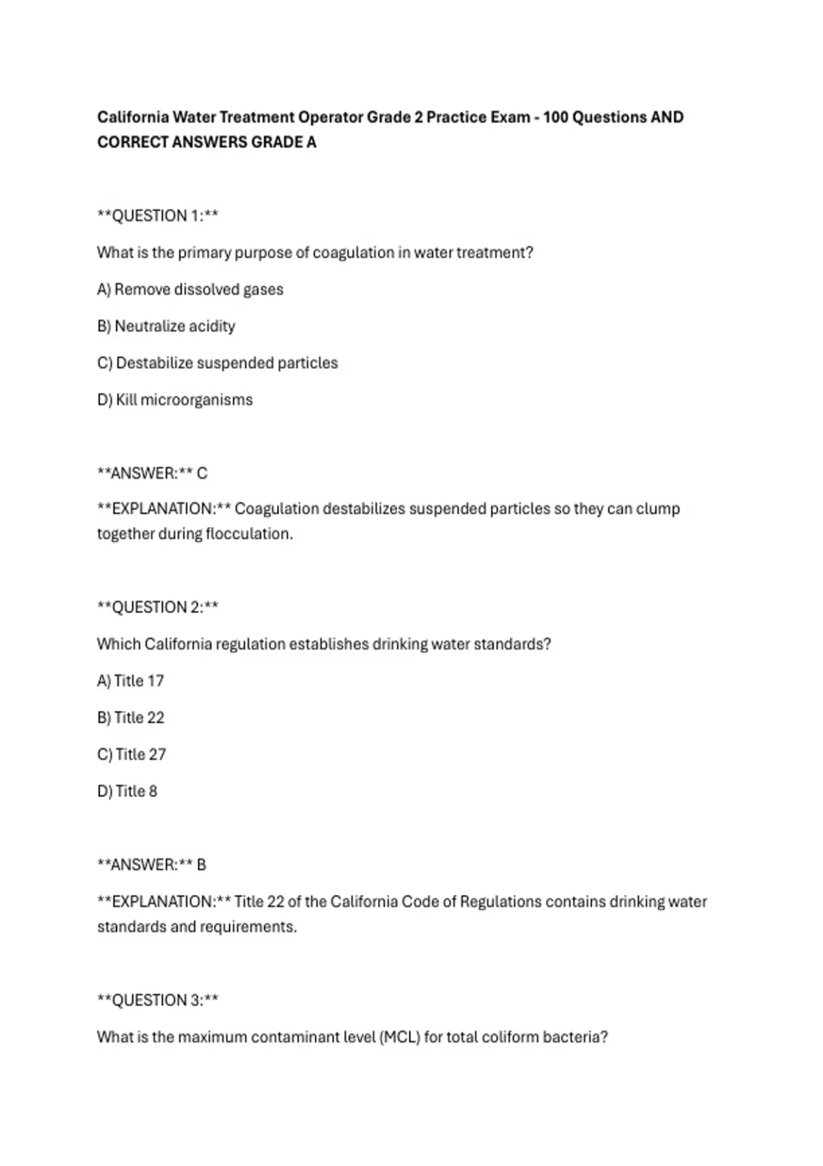 California Water Treatment Operator Grade 2 Practice Exam - 100 Questions AND