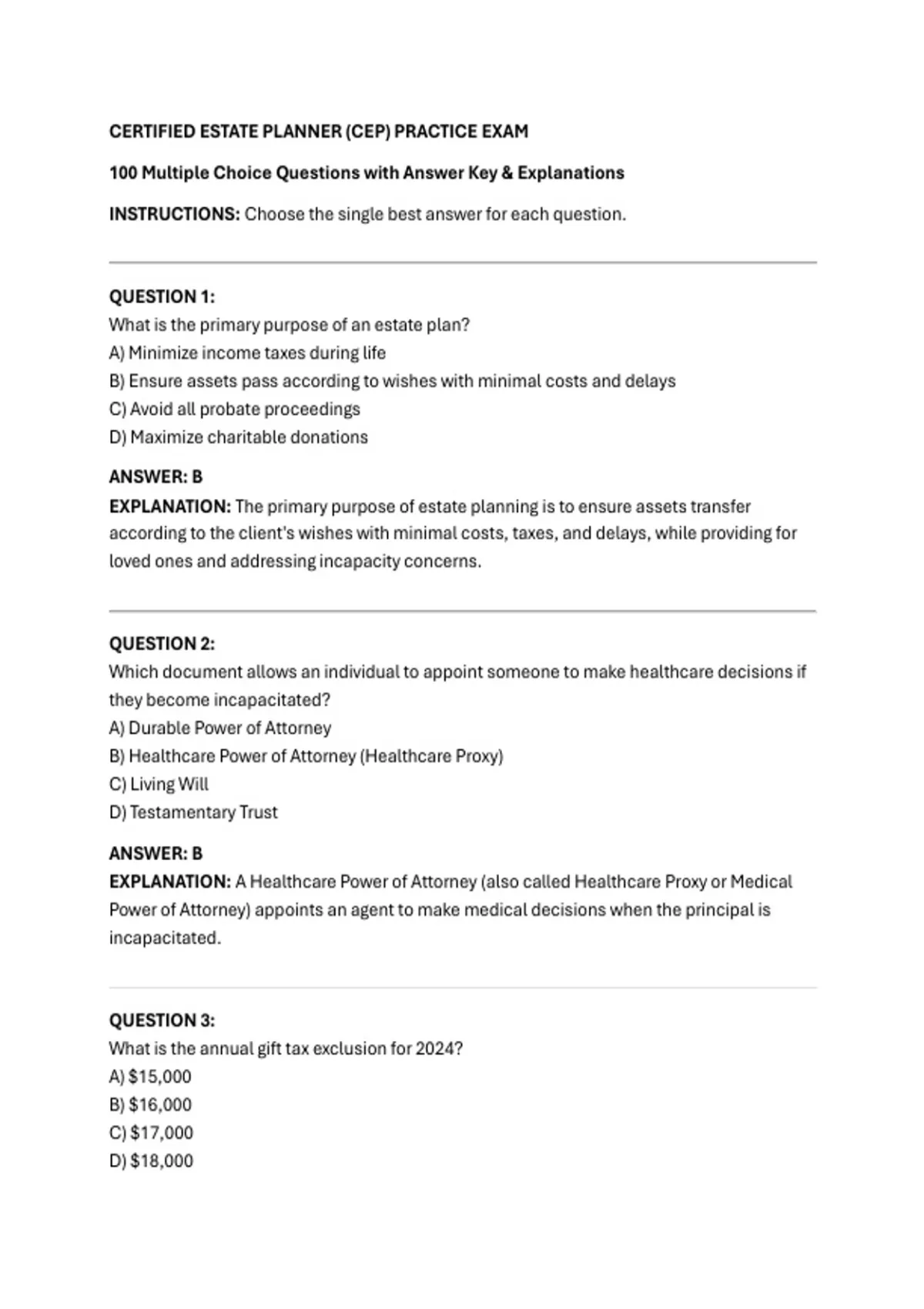 CERTIFIED ESTATE PLANNER (CEP) PRACTICE EXAM 100 Multiple Choice Questions with Answer Key & Explanations