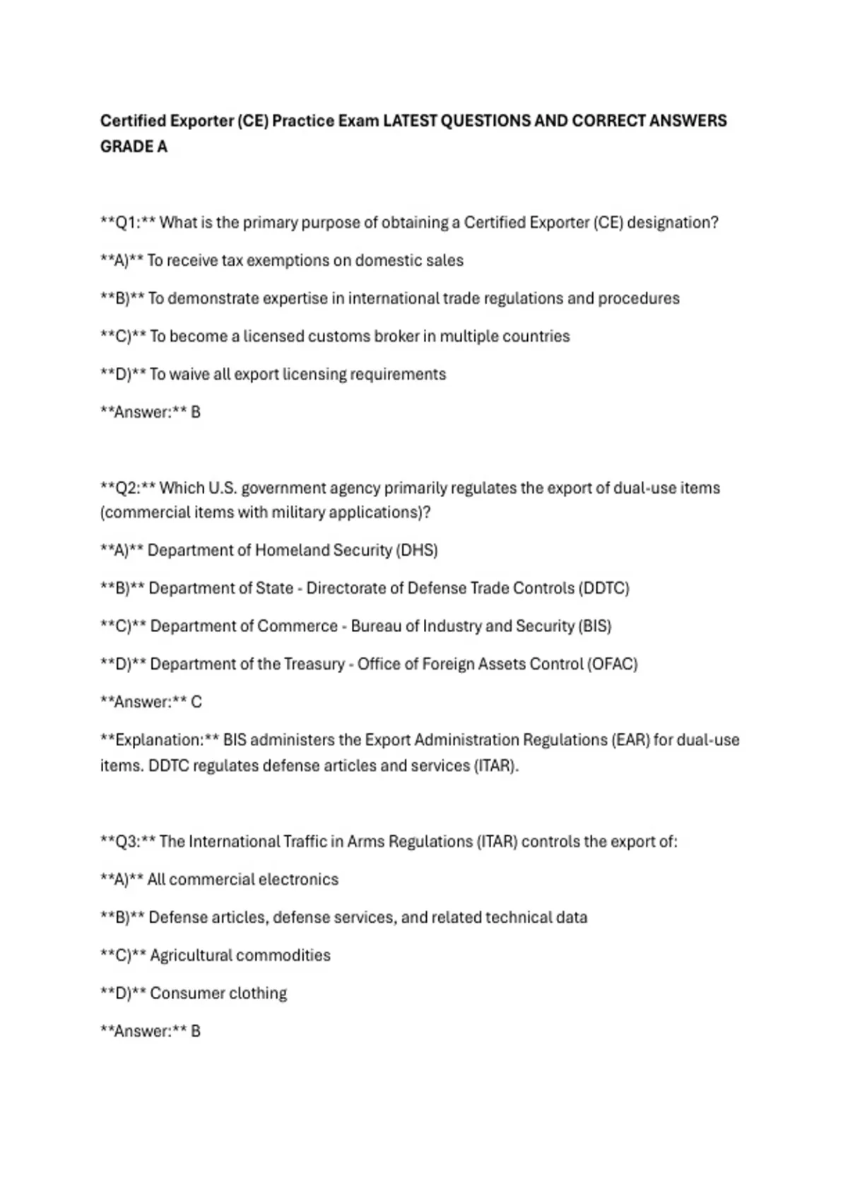 Certified Exporter (CE) Practice Exam LATEST QUESTIONS AND CORRECT ANSWERS