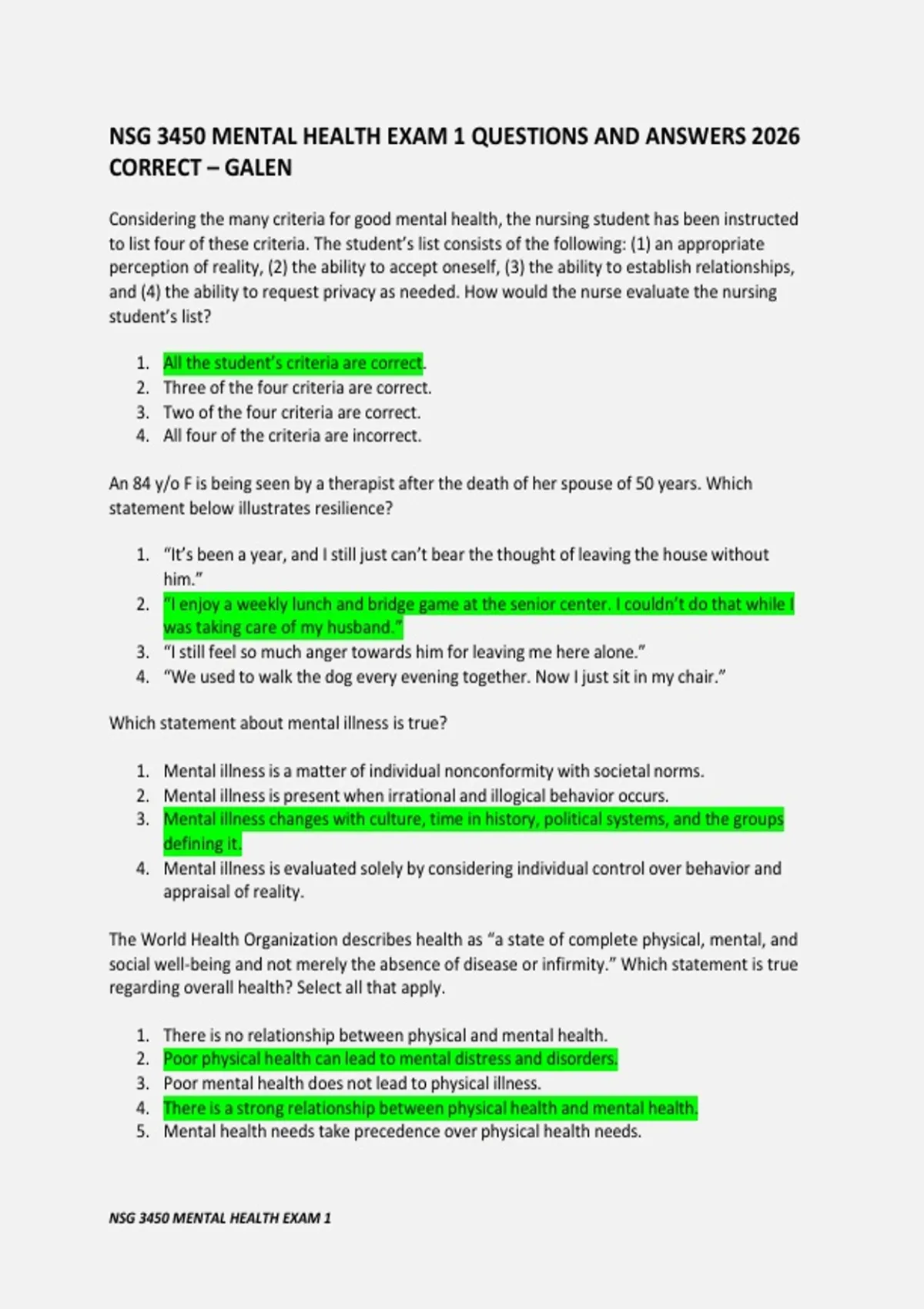 NSG 3450 MENTAL HEALTH EXAM 1 QUESTIONS AND ANSWERS 2026