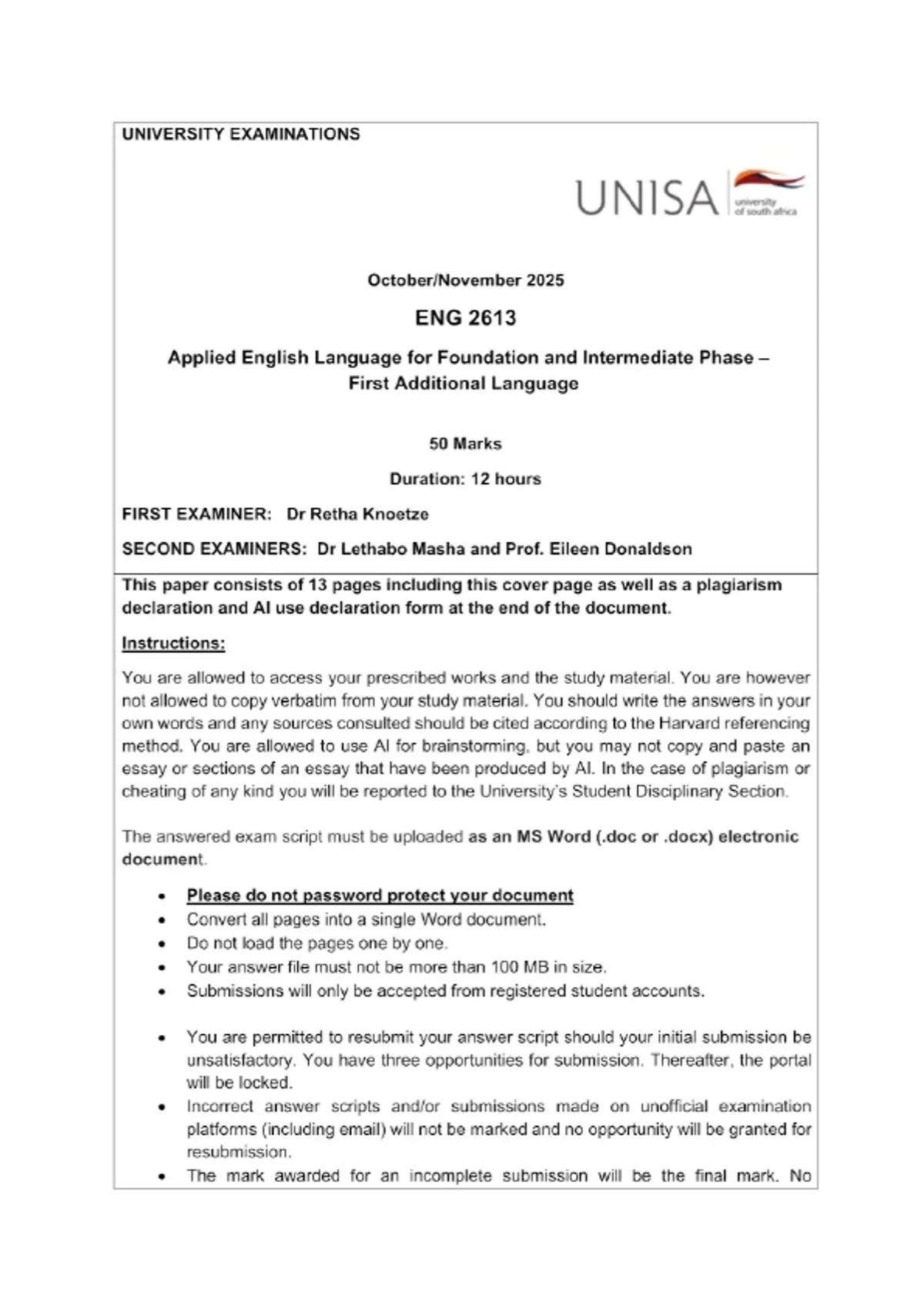 ENG2613 EXAM PACK 2026 – QUESTION & ANSWERS QUESTIONS WITH ANSWERS, COMPILED FROM RECENT PAST EXAM PAPERS. PERFECT FOR EXAM PREPARATION