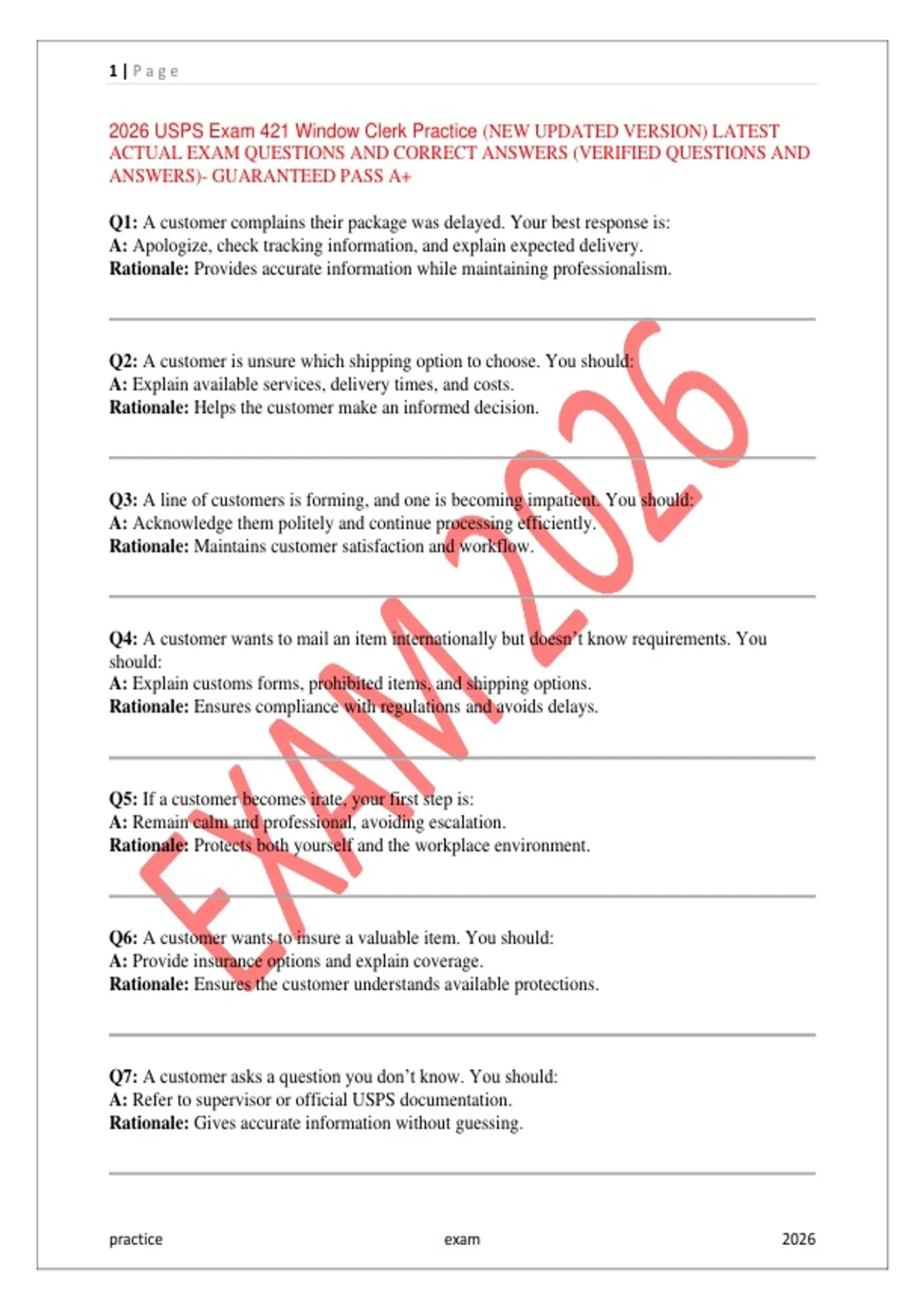 Prepare with confidence using the 2026 USPS Exam 421 Window Clerk Practice – Updated Edition. This study guide includes latest exam-based practice questions with verified correct answers, carefully designed to reflect the current USPS Window Clerk (Exam 421) assessment format. What’s Included: Updated 2026 exam-style questions Accurate, verified answers Coverage of USPS operations, mail classes, forms, timing, and customer service Easy-to-understand explanations Ideal for first-time test takers and retakes