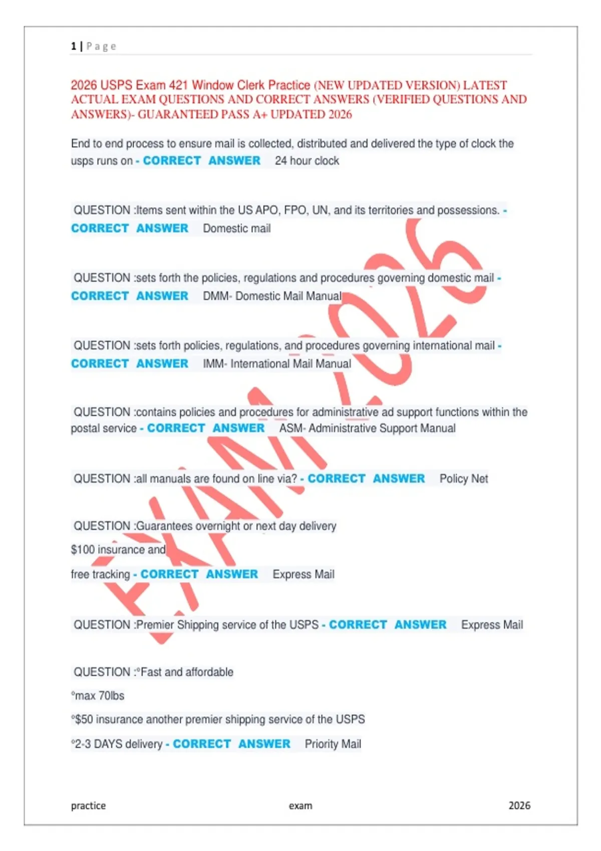 Prepare with confidence using the 2026 USPS Exam 421 Window Clerk Practice – Updated Edition. This study guide includes latest exam-based practice questions with verified correct answers, carefully designed to reflect the current USPS Window Clerk (Exam 421) assessment format. What’s Included: Updated 2026 exam-style questions Accurate, verified answers Coverage of USPS operations, mail classes, forms, timing, and customer service Easy-to-understand explanations Ideal for first-time test takers and retakes