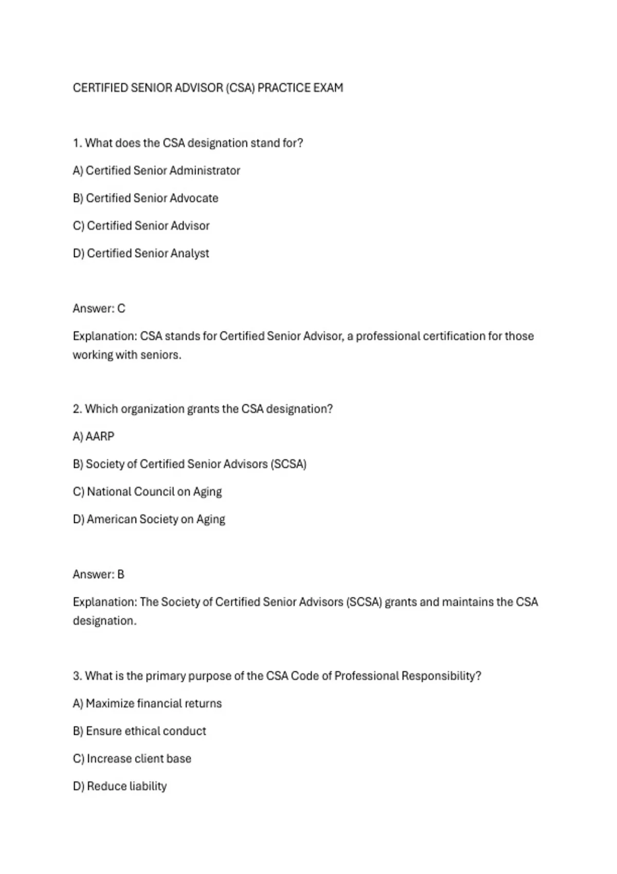 CERTIFIED SENIOR ADVISOR (CSA) PRACTICE EXAM