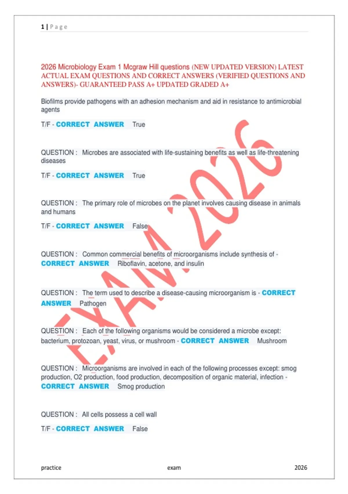 2026 Microbiology Exam 1 McGraw-Hill – NEW Updated Version | Latest Exam Questions & Verified Correct Answers | Guaranteed Pass A+