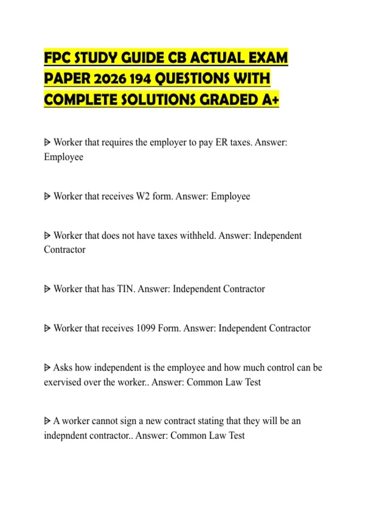 indepndent contractor.. Answer: Common Law Test
