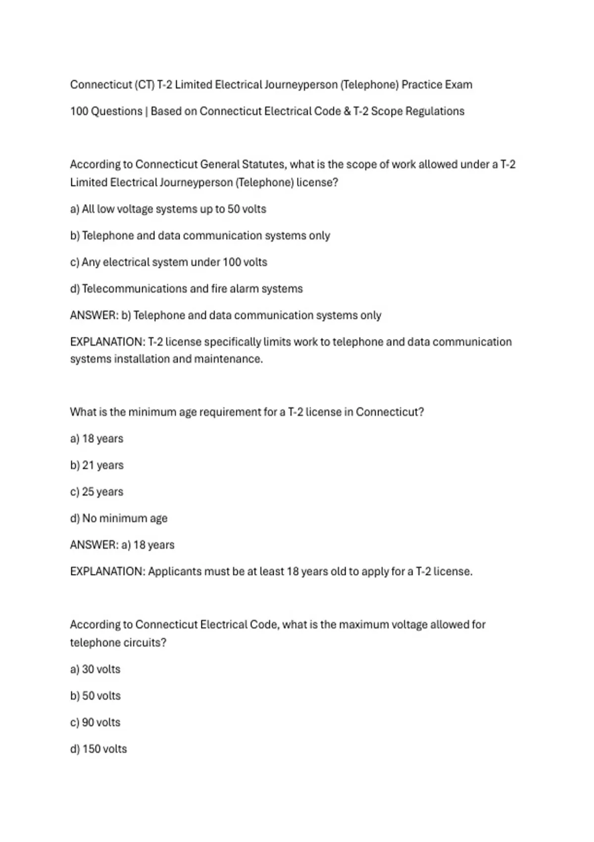 Connecticut (CT) T-2 Limited Electrical Journeyperson (Telephone) Practice Exam 100 Questions | Based on Connecticut Electrical Code & T-2 Scope Regulations