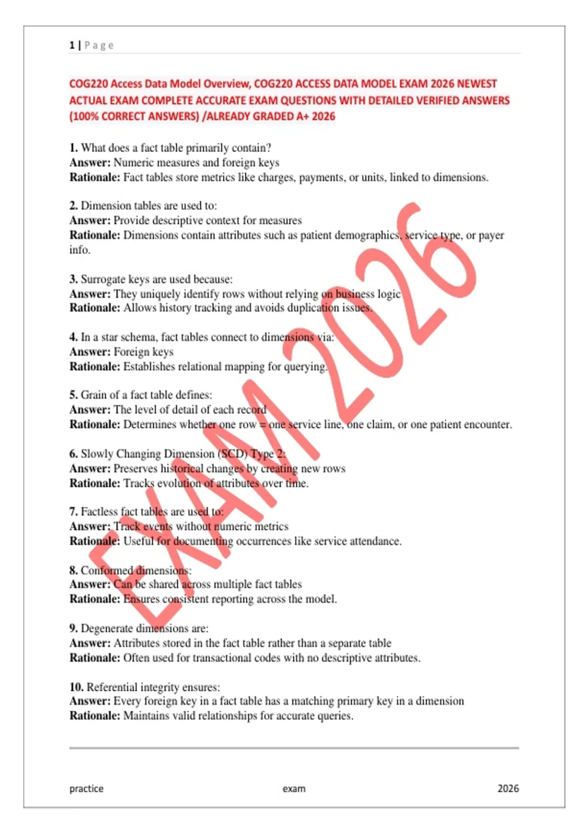 Ace your COG220 Access Data Model Exam with the 2026 newest updated study guide. This resource features complete exam questions with detailed, verified answers, ensuring you’re fully prepared to pass and achieve a high grade. What’s Included: Complete COG220 Access Data Model Exam 2026 questions Detailed verified answers (100% correct) Step-by-step explanations of database concepts Covers Access tables, queries, forms, reports, relationships, and normalization Ideal for final review, self-study, or retake preparation Already graded A+ for accuracy