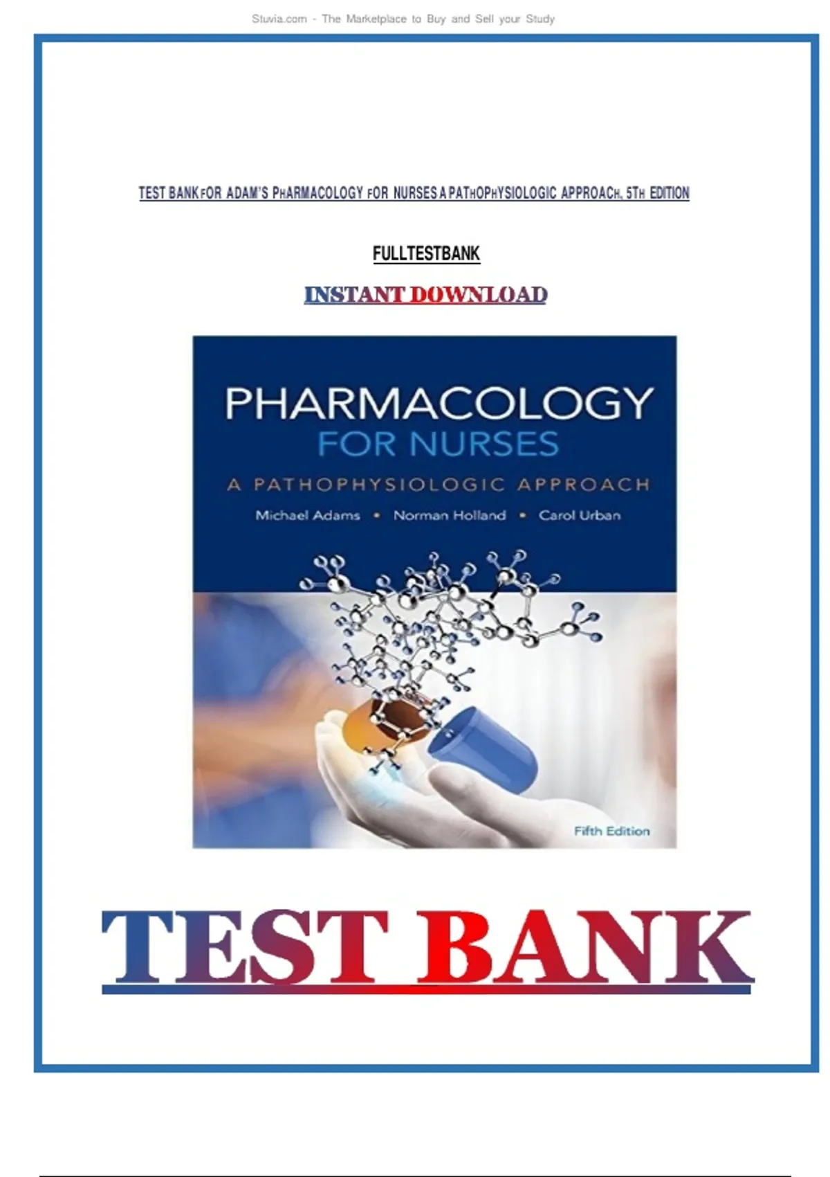 TEST BANK FOR Pharmacology for Nurses: A Pathophysiologic Approach 5th Edition by Michael Adams, Norman Holland, Carol Urban ISBN: 978-0134255163 COMPLETE GUIDE ALL CHAPTERS COVERED 100% VERIFIED A+ GRADE ASSURED!!!!!NEW LATEST UPDATE!!!!!
