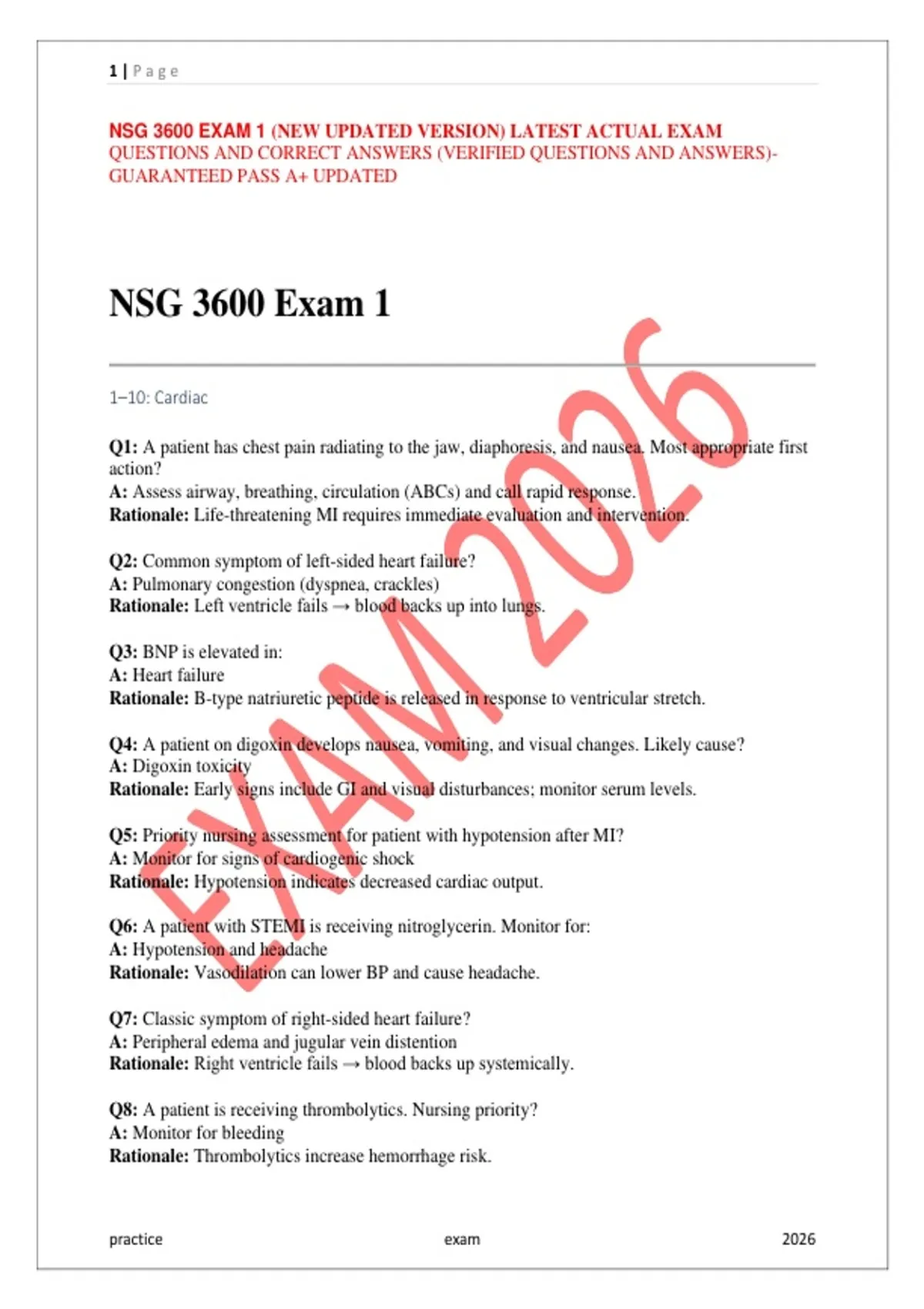 Prepare to ace NSG 3600 Exam 1 with this 2026 updated study guide. This resource features exam-style questions with verified correct answers, designed to help you pass with confidence and earn a high grade. What’s Included: Latest NSG 3600 Exam 1 questions (updated version) Verified correct answers for every question Detailed explanations for understanding concepts Covers nursing fundamentals, clinical reasoning, patient care, pharmacology, and critical thinking Ideal for self-study, final exam prep, or review sessions Guaranteed pass A+