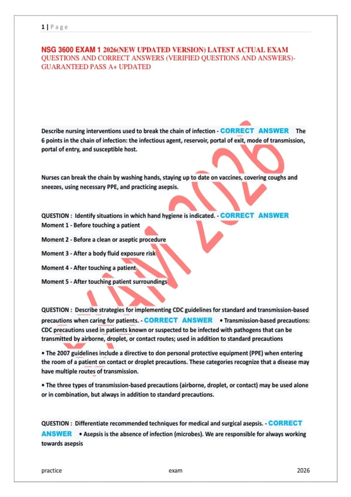 Prepare to ace NSG 3600 Exam 1 with this 2026 updated study guide. This resource features exam-style questions with verified correct answers, designed to help you pass with confidence and earn a high grade. What’s Included: Latest NSG 3600 Exam 1 questions (updated version) Verified correct answers for every question Detailed explanations for understanding concepts Covers nursing fundamentals, clinical reasoning, patient care, pharmacology, and critical thinking Ideal for self-study, final exam prep, or review sessions Guaranteed pass A+
