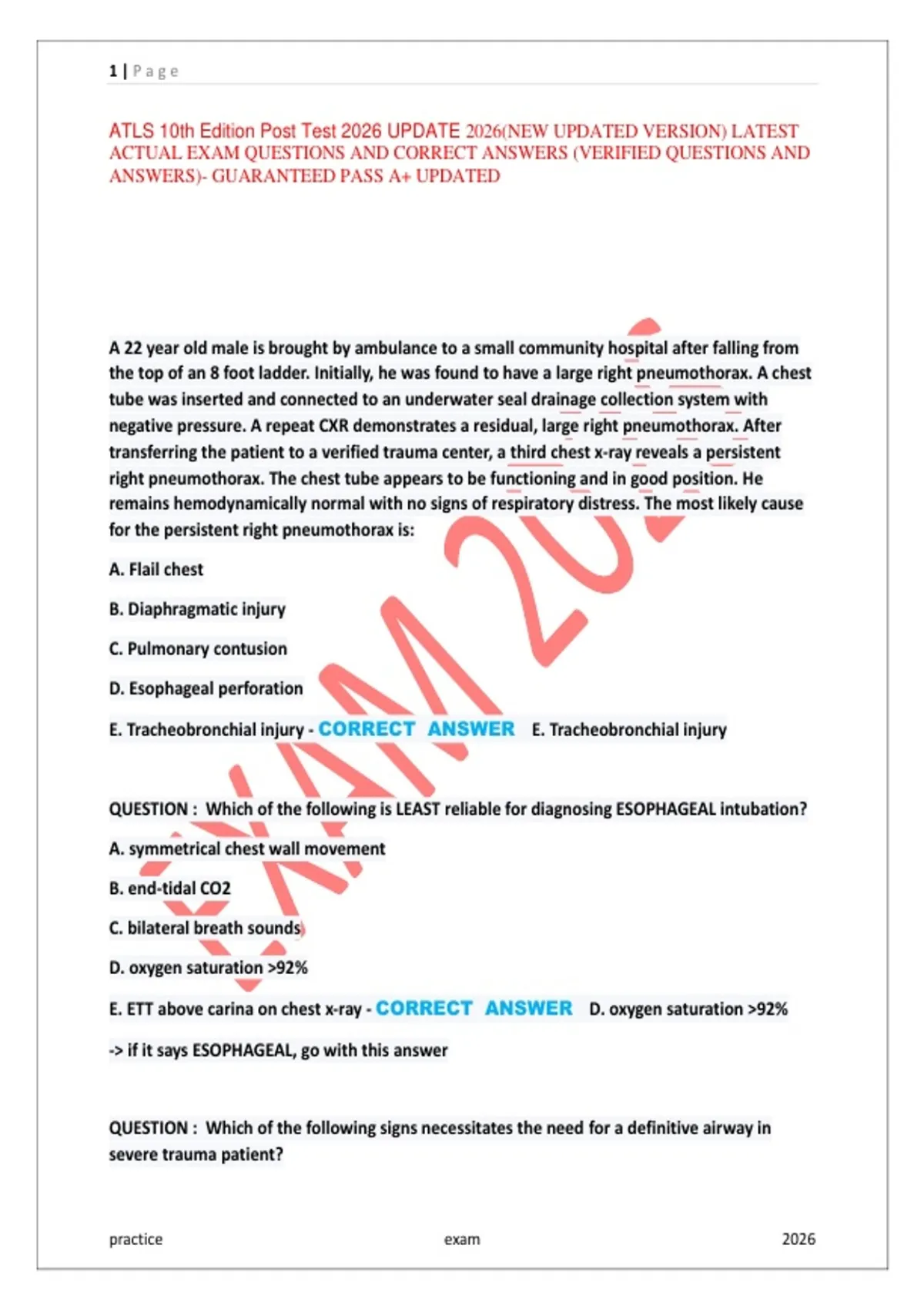 Prepare for the ATLS 10th Edition Post Test 2026 with this fully updated study guide. This resource contains exam-style questions with verified correct answers, designed to help healthcare professionals and students pass confidently and achieve a high score. What’s Included: Updated 2026 ATLS Post Test questions Verified correct answers for every question Detailed explanations for key trauma and emergency concepts Covers trauma assessment, airway management, shock, chest and abdominal injuries, neuro trauma, and pediatric trauma Ideal for final review, self-study, and exam preparation Guaranteed pass A+