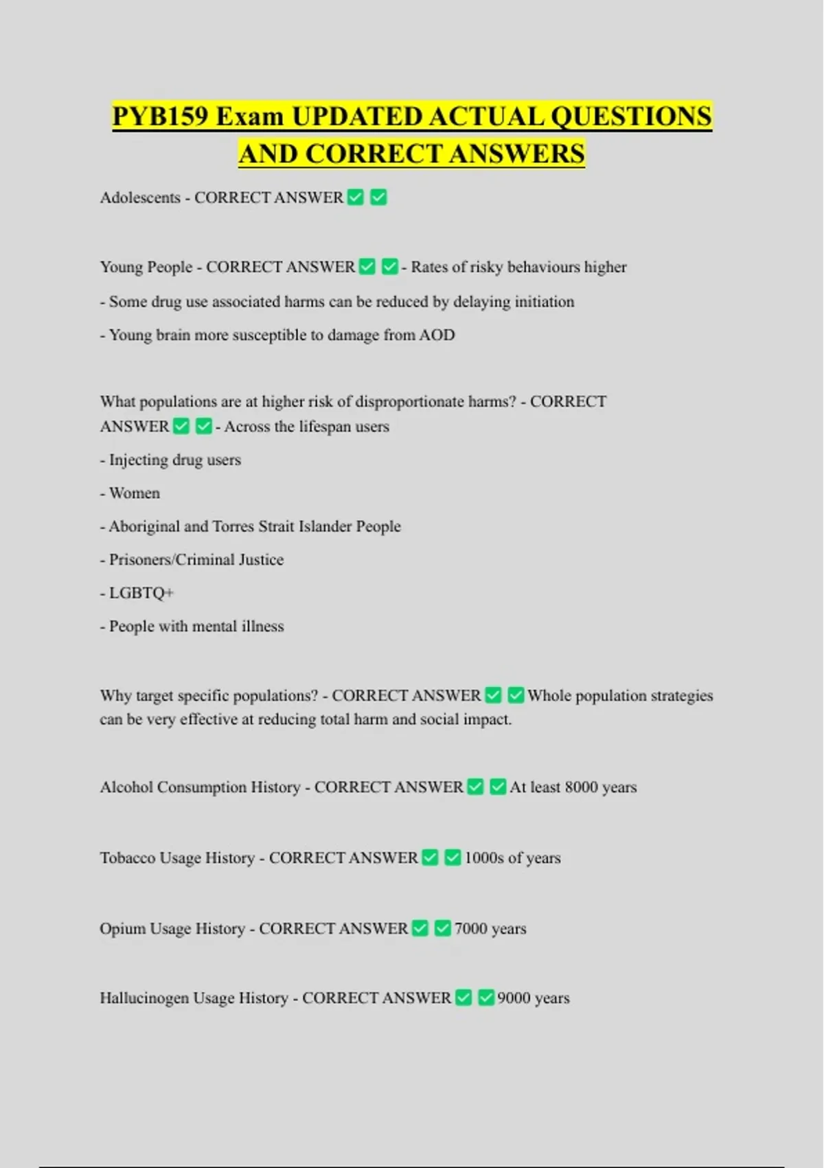 PYB159 Exam UPDATED ACTUAL QUESTIONS AND CORRECT ANSWERS Adolescents - CORRECT ANSWER Young People - CORRECT ANSWER - Rates of risky behaviours higher - Some drug use associated harms can be reduced by delaying initiation - Young brain more susceptible to damage from AOD What populations are at higher risk of disproportionate harms? - CORRECT ANSWER - Across the lifespan users - Injecting drug users - Women - Aboriginal and Torres Strait Islander People - Prisoners/Criminal Justice - LGBTQ+ - People with mental illness Why target specific populations? - CORRECT ANSWER can be very effective at reducing total harm and social impact. Alcohol Consumption History - CORRECT ANSWER Tobacco Usage History - CORRECT ANSWER Opium Usage History - CORRECT ANSWER Hallucinogen Usage History - CORRECT ANSWER Whole population strategies At least 8000 years 1000s of years 7000 years 9000 years Historic Use of Drugs - CORRECT ANSWER - Ritualistic - Ceremonial - Medicinal Aboriginal people psychoactive use - CORRECT ANSWER plant-based stimulants and depressants Limited contact with some