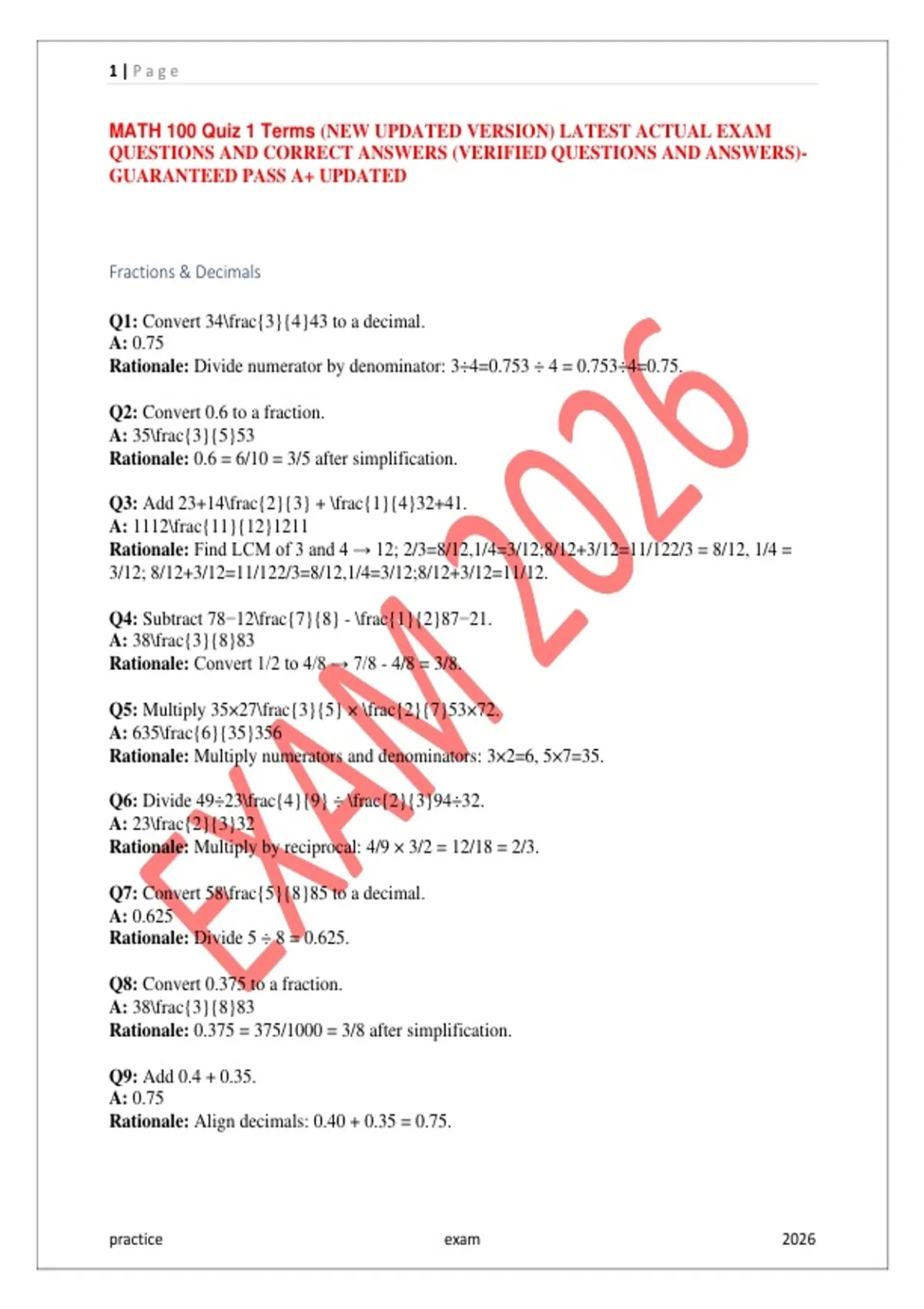 Ace MATH 100 Quiz 1 with this 2026 updated study guide. This resource features exam-style questions with verified correct answers, designed to help students master key terms and concepts and achieve a high score. What’s Included: Updated 2026 MATH 100 Quiz 1 questions Verified correct answers for every question Key terms and definitions clearly explained Covers basic algebra, functions, graphing, equations, and problem-solving concepts Ideal for self-study, final review, or exam preparation Guaranteed pass A+