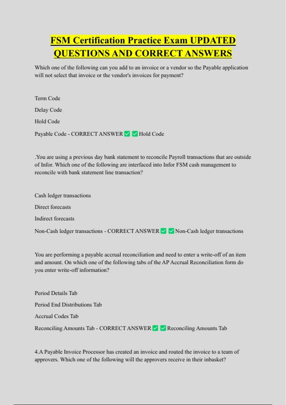 FSM Certification Practice Exam UPDATED QUESTIONS AND CORRECT ANSWERS Which one of the following can you add to an invoice or a vendor so the Payable application will not select that invoice or the vendor's invoices for payment? Term Code Delay Code Hold Code Payable Code - CORRECT ANSWER Hold Code .You are using a previous day bank statement to reconcile Payroll transactions that are outside of Infor. Which one of the following are interfaced into Infor FSM cash management to reconcile with bank statement line transaction? Cash ledger transactions Direct forecasts Indirect forecasts Non-Cash ledger transactions - CORRECT ANSWER Non-Cash ledger transactions You are performing a payable accrual reconciliation and need to enter a write-off of an item and amount. On which one of the following tabs of the AP Accrual Reconciliation form do you enter write-off information? Period Details Tab Period End Distributions Tab Accrual Codes Tab Reconciling Amounts Tab - CORRECT ANSWER Reconciling Amounts Tab 4.A Payable Invoice Processor has created an invoice and routed the invoice to a team of approvers. Which one of the following will the approvers receive in their inbasket? Approval code Output file Work Unit Task - CORRECT ANSWER Task