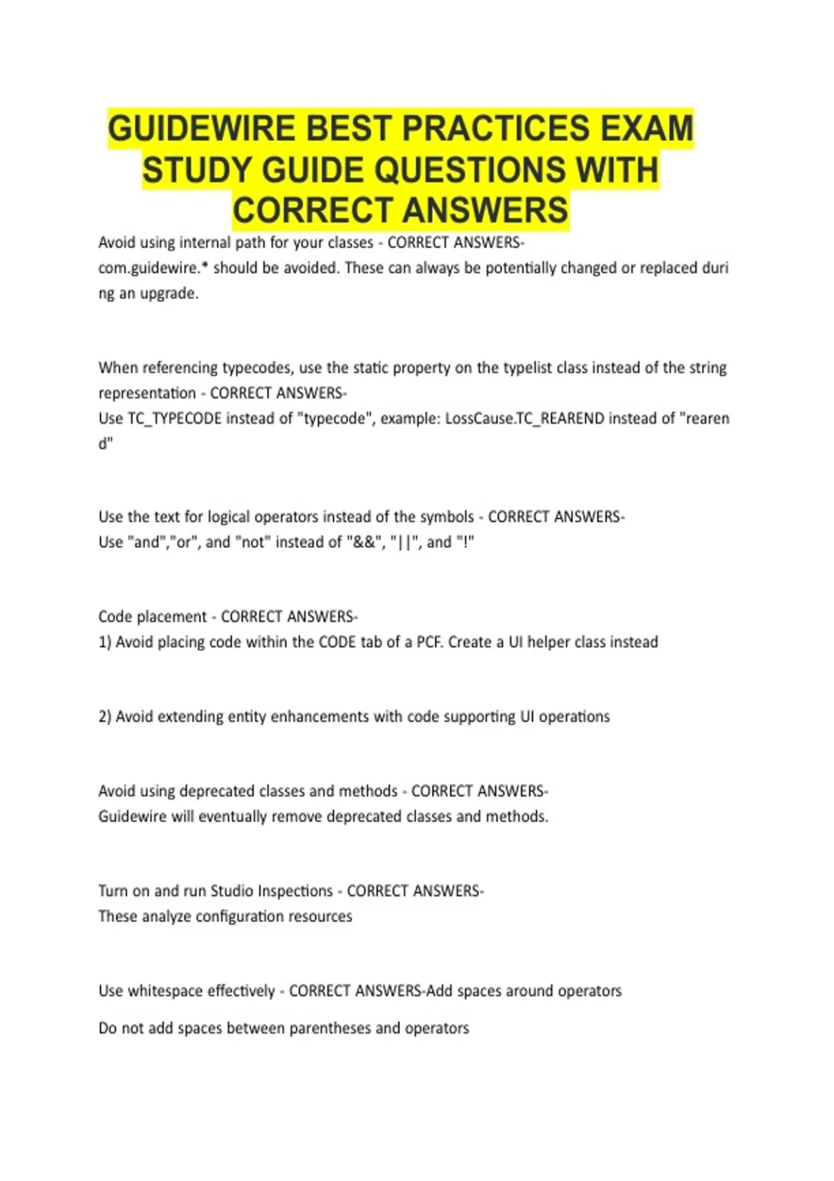 GUIDEWIRE BEST PRACTICES EXAM STUDY GUIDE QUESTIONS WITH CORRECT ANSWERS